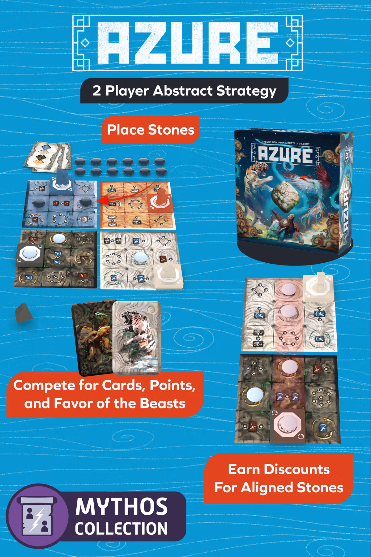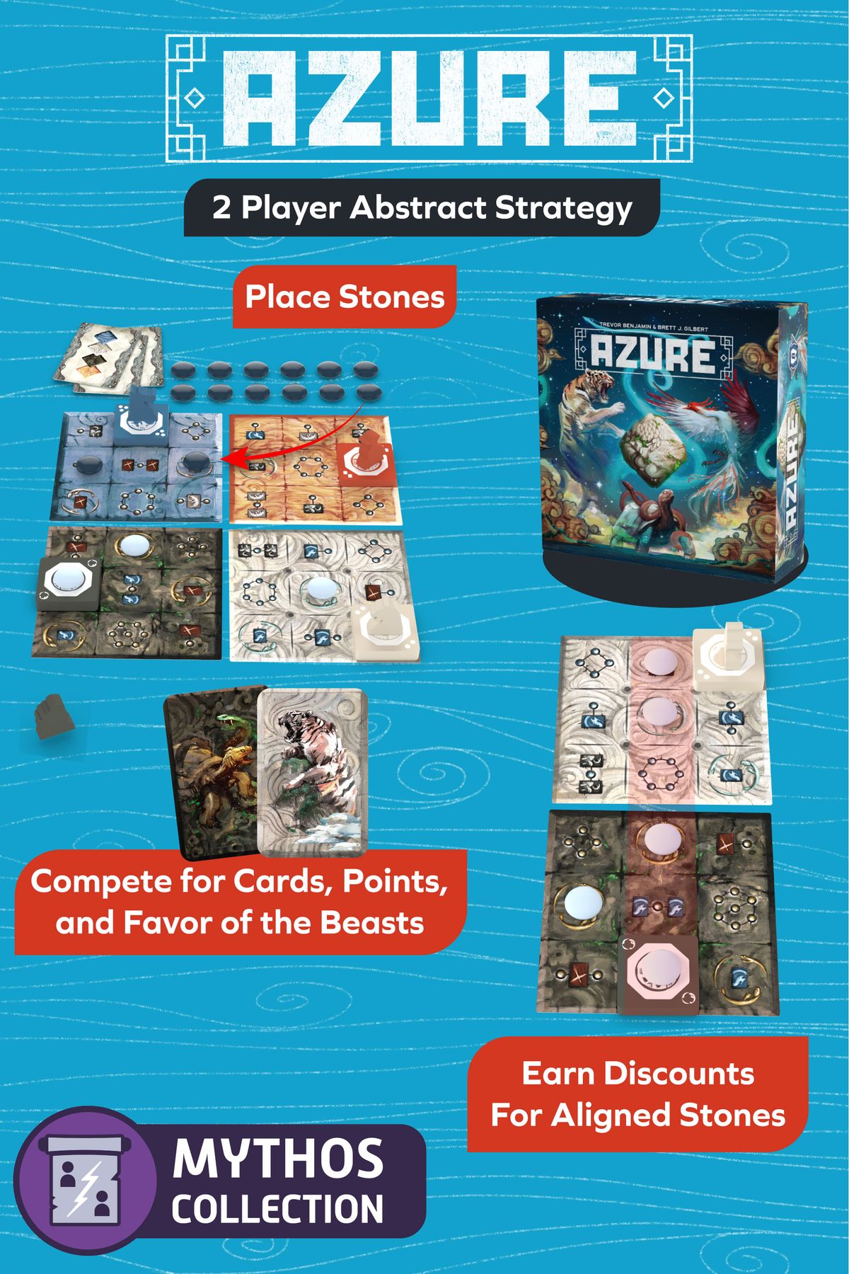 In Azure, players position their stones to gather qi (cards) and wisdom (points) from the realm. They also compete to bring the Auspicious Beasts to their aid. The first player to reach the end of the path of wisdom wins.