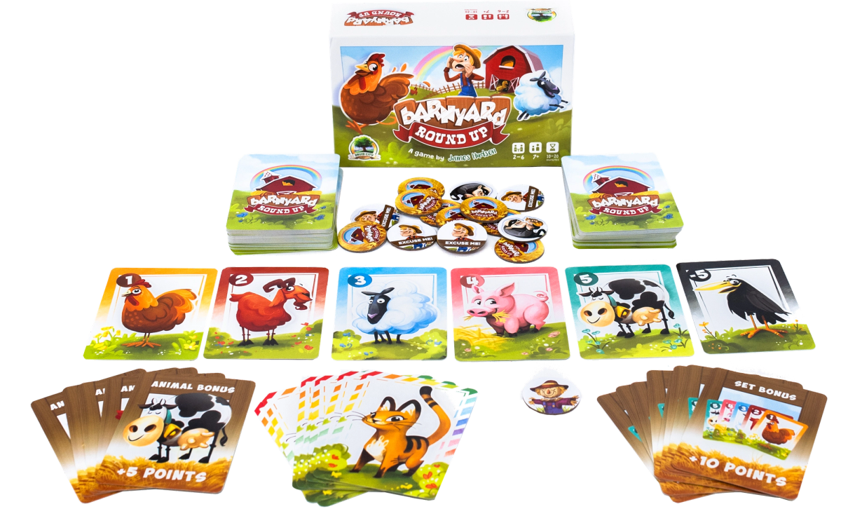 Barnyard Roundup is a family-friendly, appropriate game for ages 7 and up. We have played the game with players as young as 4 and had a lot of fun! Everyone in the family will enjoy this game, we have even brought this out on game night with the adults and had a great time!
