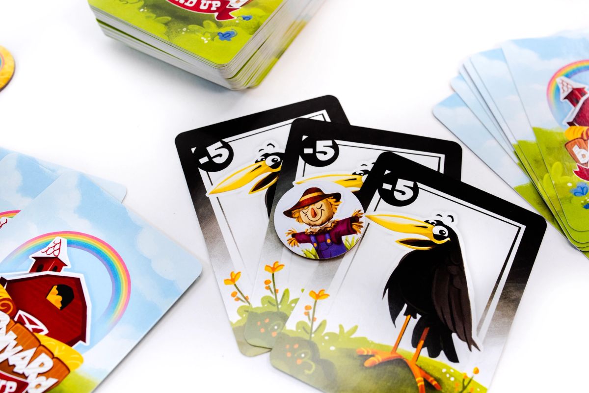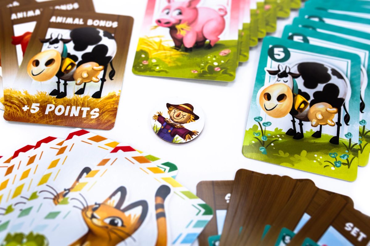 The goal of the game is to collect the most valuable farm animals for Farmer Brown to sell on Market Day. You do this by playing cards face-down from your hand and declaring what they are, then giving one other player the choice to decide if you are bluffing or telling the truth. If they choose correctly, THEY get the Farm Animal card(s) you played, but if they guess wrong, YOU get the card instead. Whoever wins Farm Animal cards adds them to their collection. But you may also get Crows, pests that irritate Farmer Brown and count against you in the scoring.