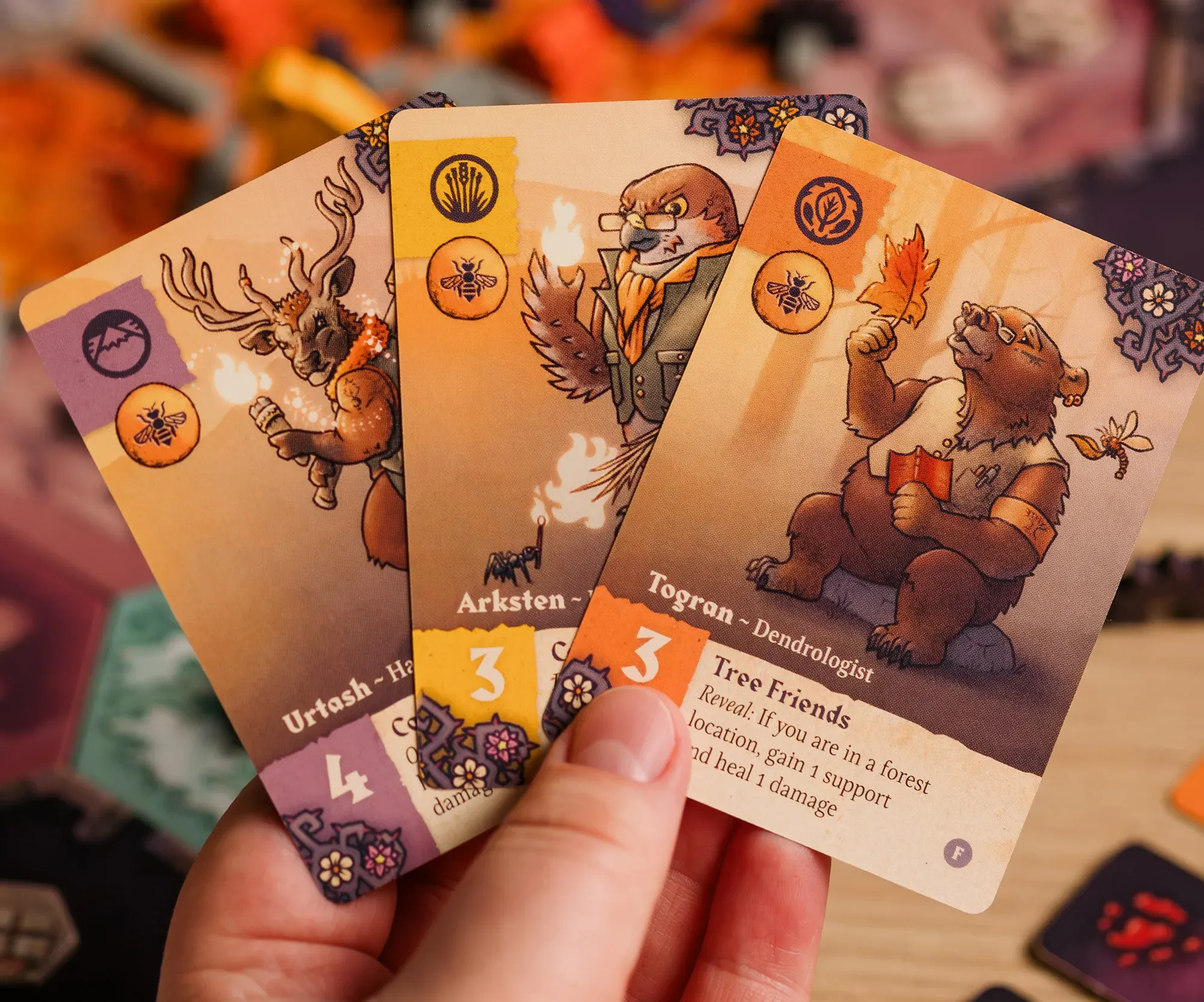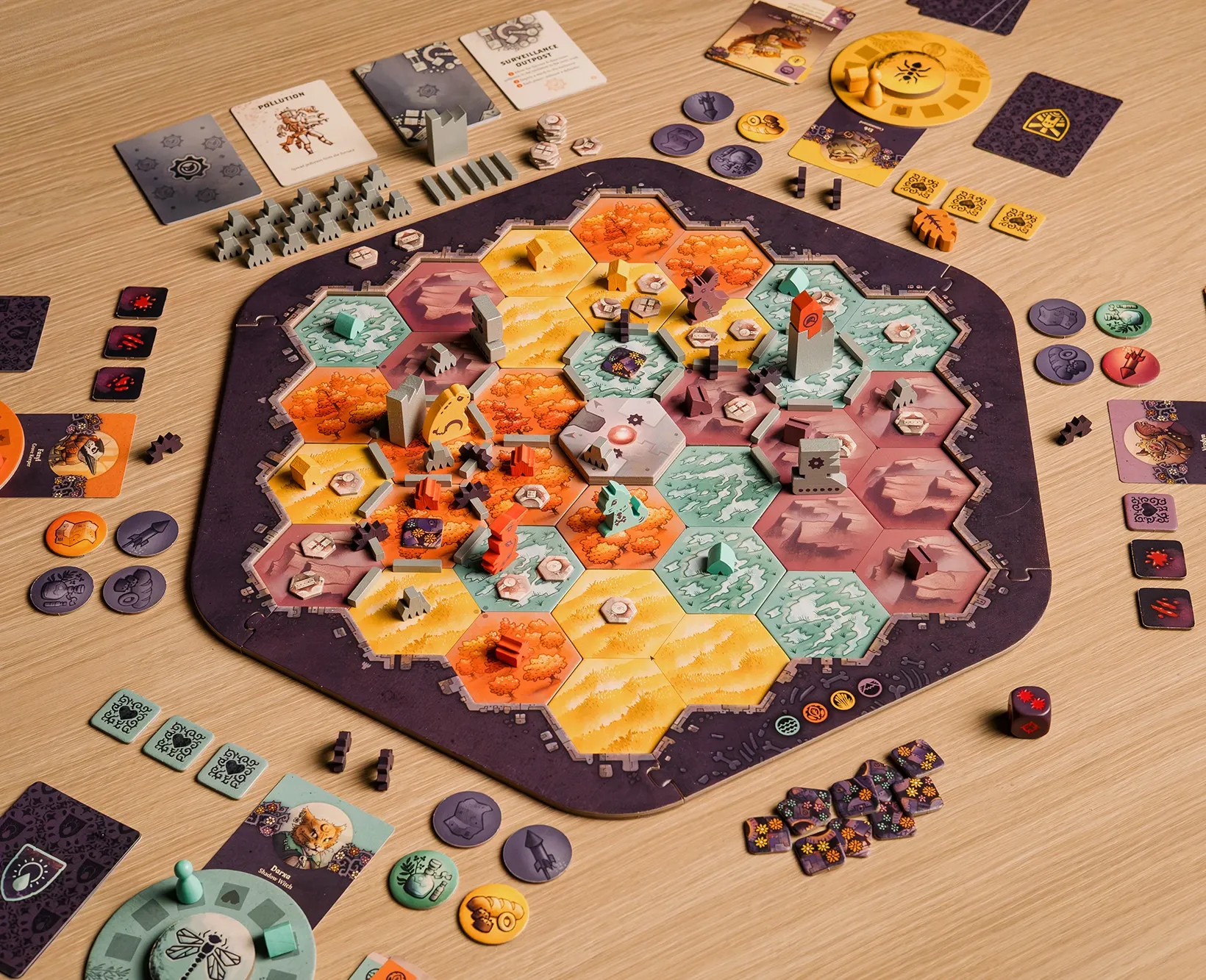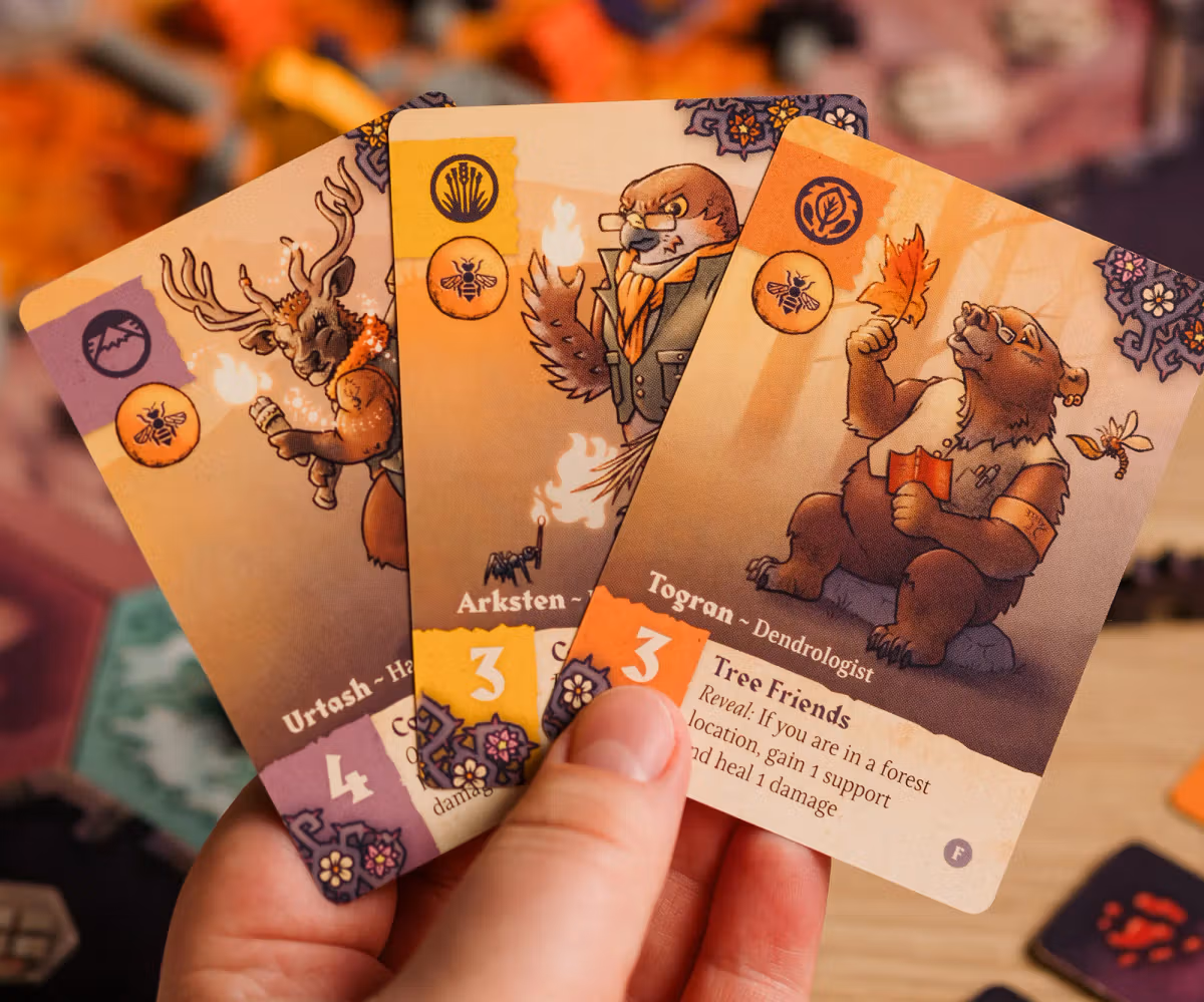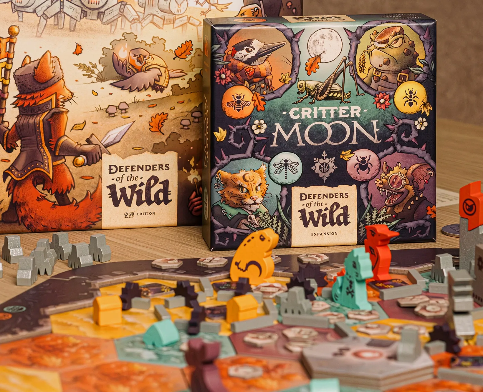The Critter Moon expansion includes 8 new wooden animal organizers, 48 new defender cards, and 4 new critter tokens.