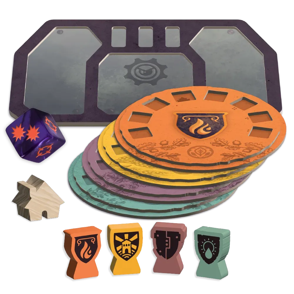 Silk screened shield support trackers: Printed shield support trackers replace the standard pawns, 1 for each of the 4 factions.