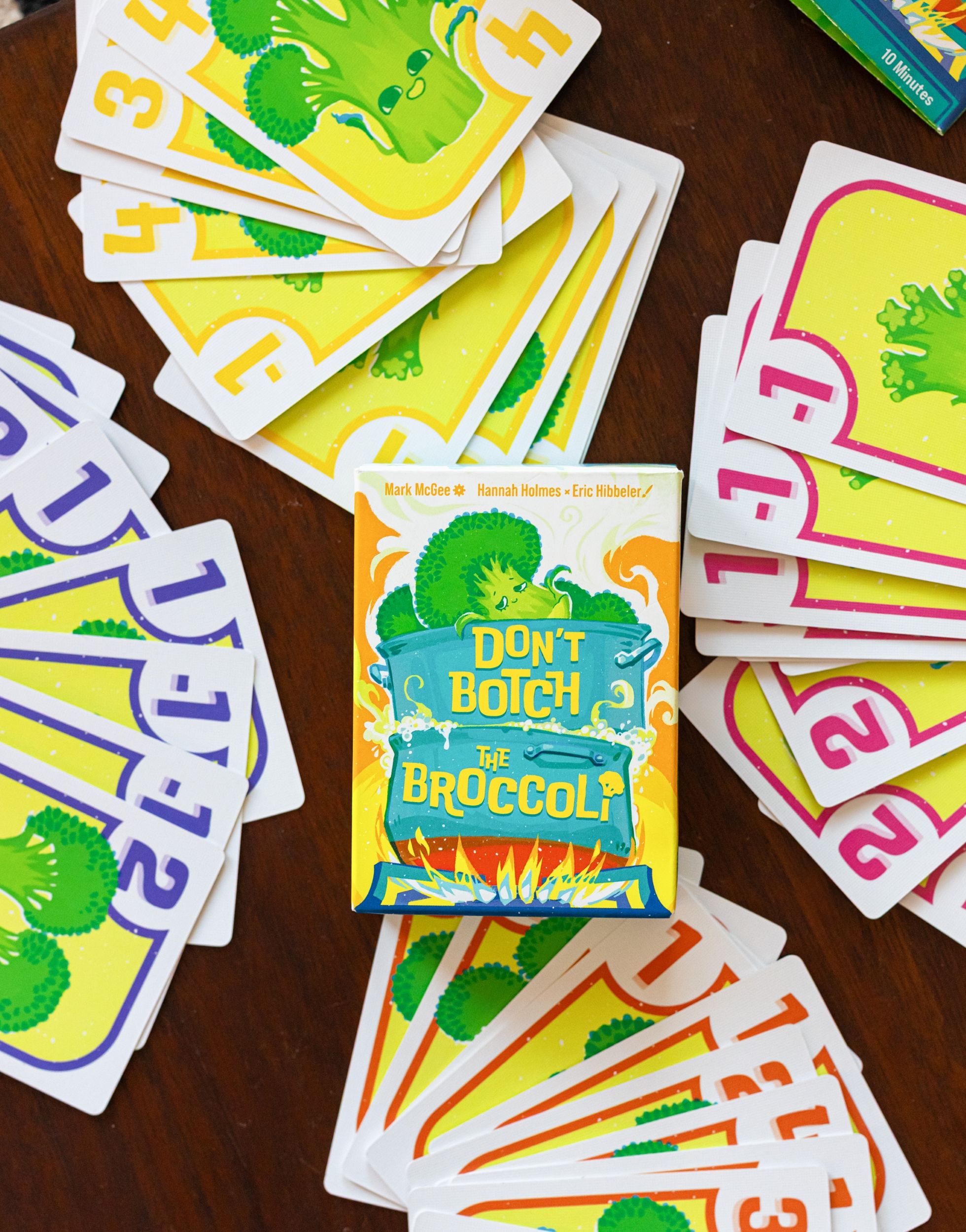 In Don't Botch the Broccoli, players have a hand of broccoli cards and simultaneously play one each turn. Players who play the same number move their card to their steamer, then whoever played the lowest remaining card gets to cook their broccoli, scoring it and any cards in their steamer. All other cards are botched and return to their owner's hand.