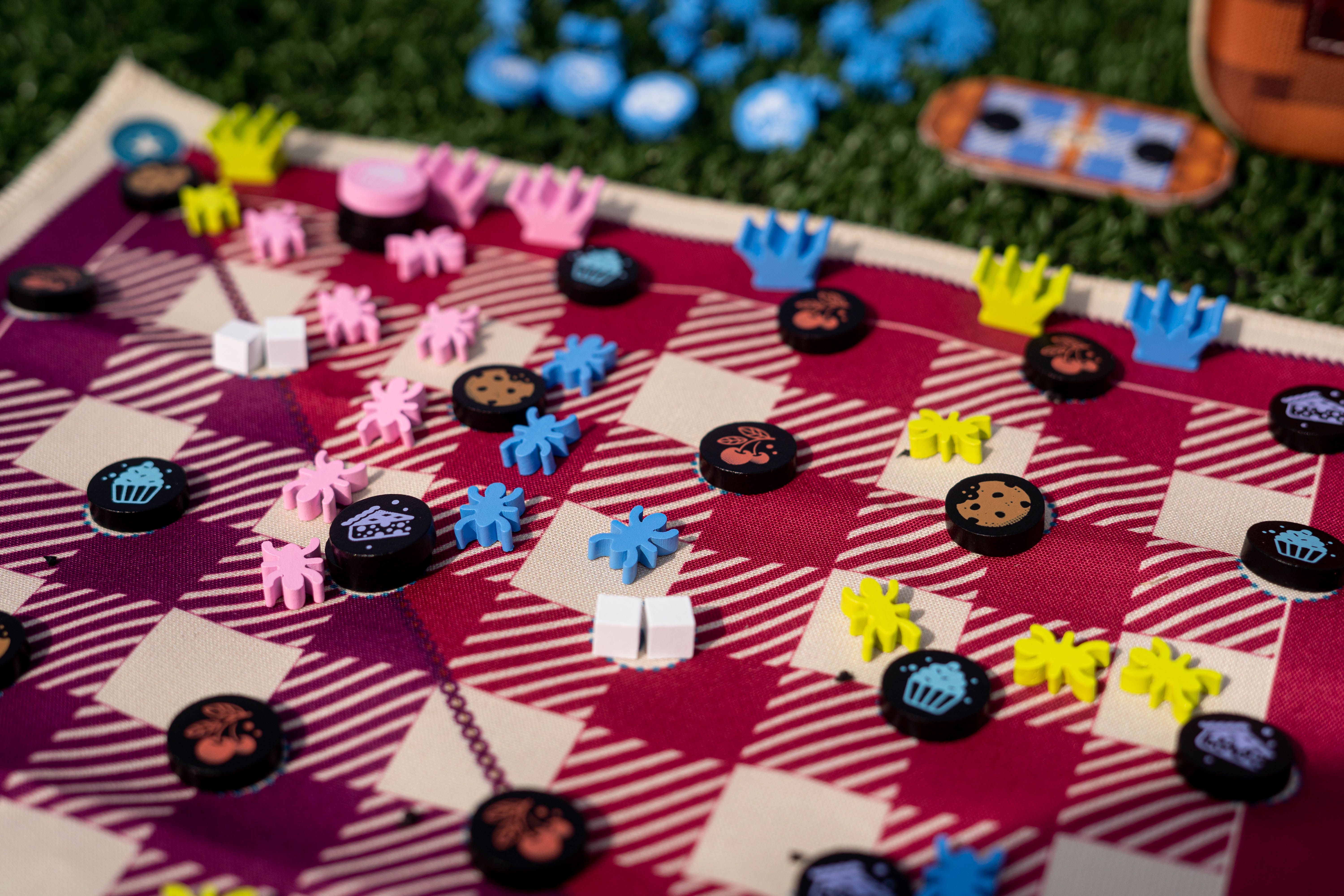 In Gingham, players position their queens around the gingham picnic blanket and deploy their ants to connect sweets and claim the stockpiles they create. Stretch your ants across the blanket, and grab the biggest piles of sweets to prove your pint-sized royalty! Gingham is the second title in Bitewing Games' Travel Line. This line of games is focused on being supremely easy to play with anyone, anywhere.