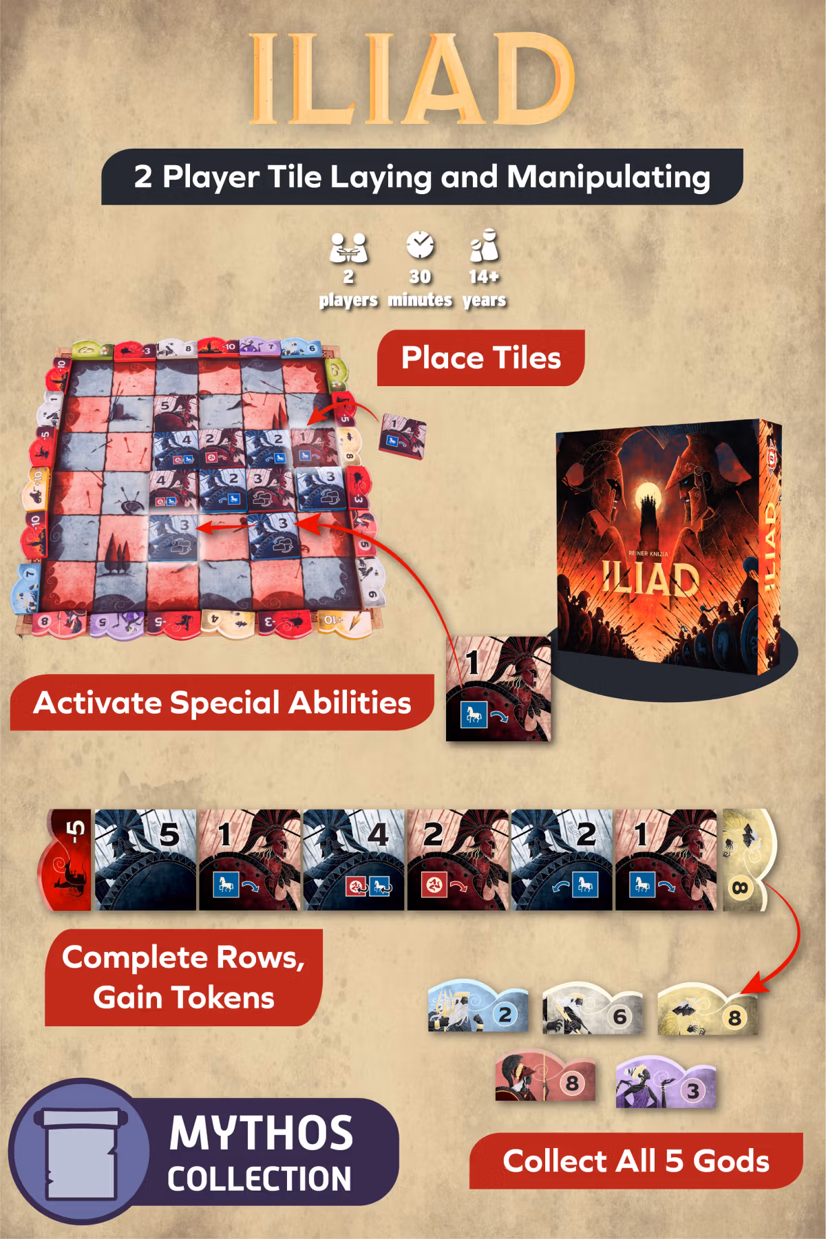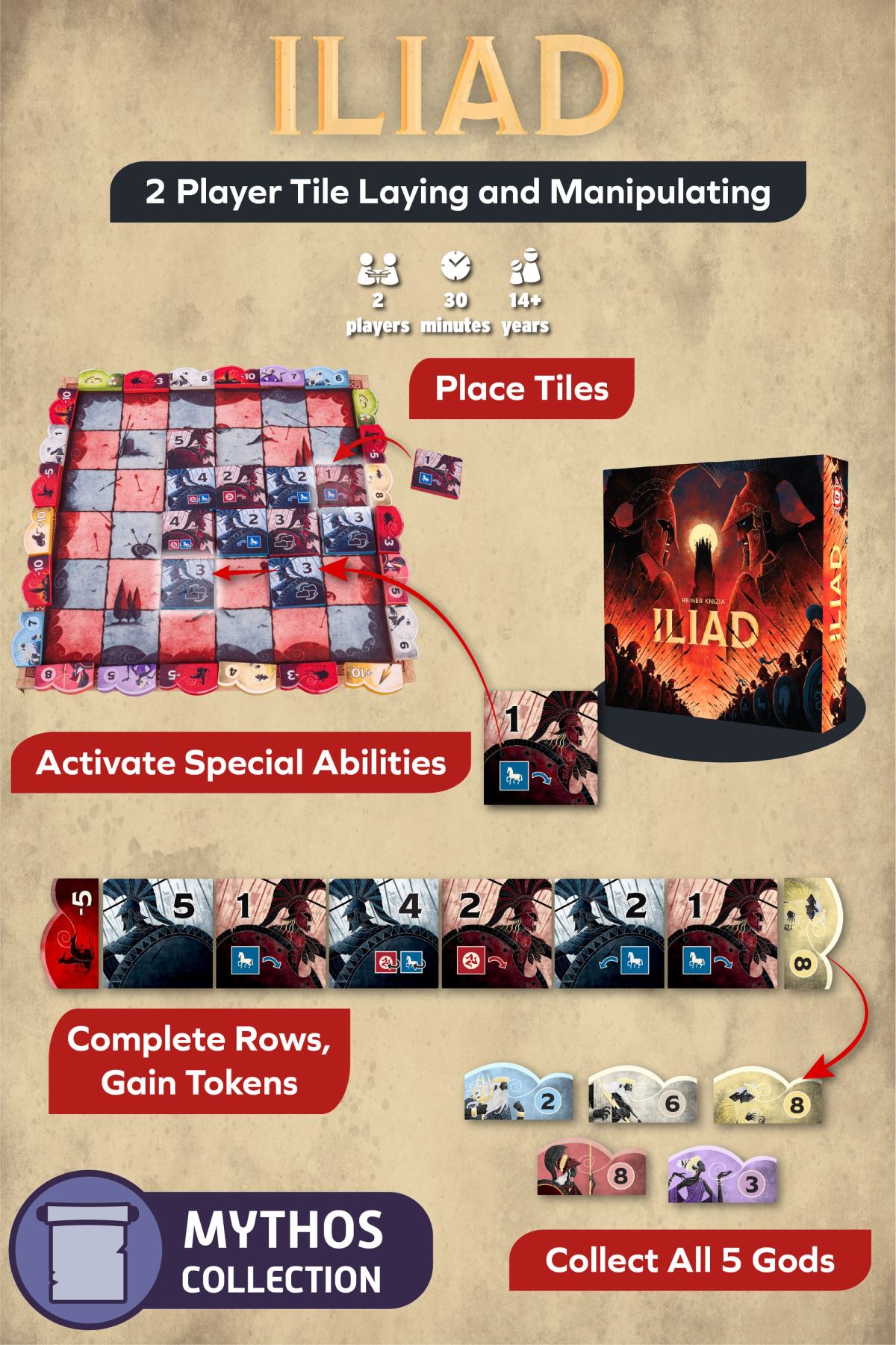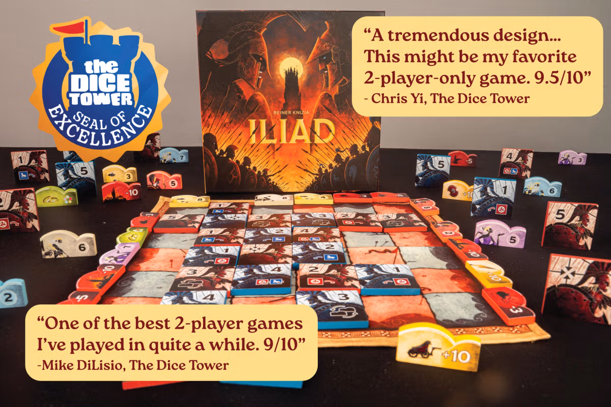 Iliad is the first game in the Mythos Collection, a line of two-player titles by Bitewing Games featuring strategy and mythology.