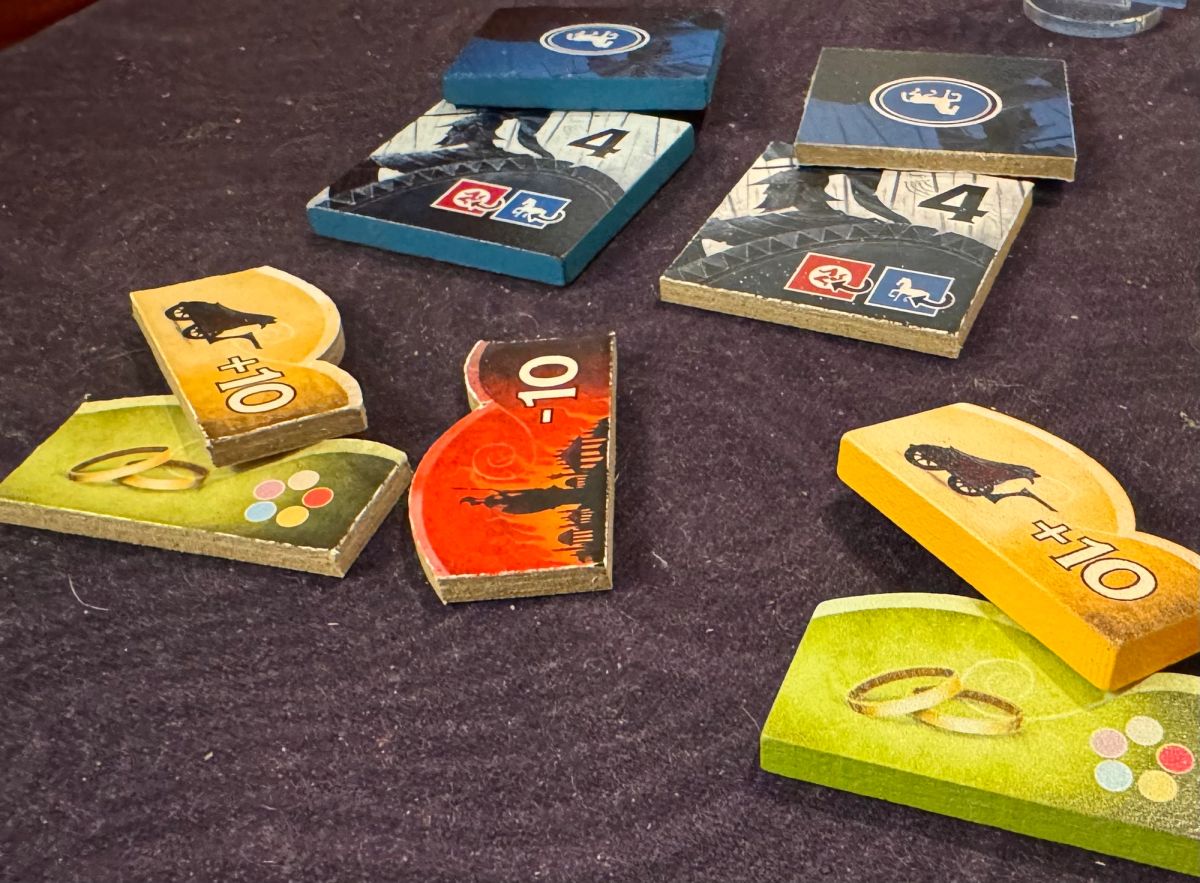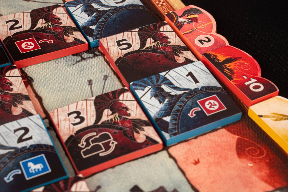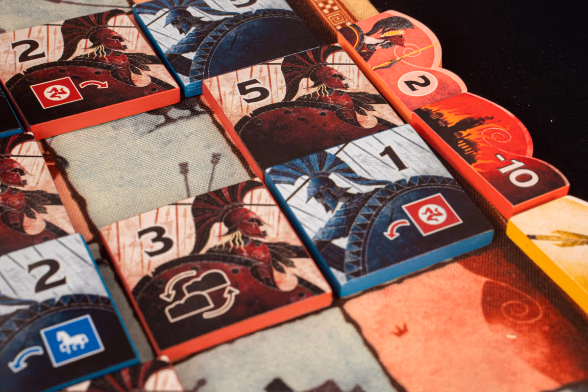 Players face tough tactical trade-offs as they must decide whether to compete for exclusive favor of the Gods or for the most points and then influence the outcome of the game toward their intended advantage. Which lines do you commit your strongest tiles to, and which success token do you claim when you win the line? These decisions are vital to success.