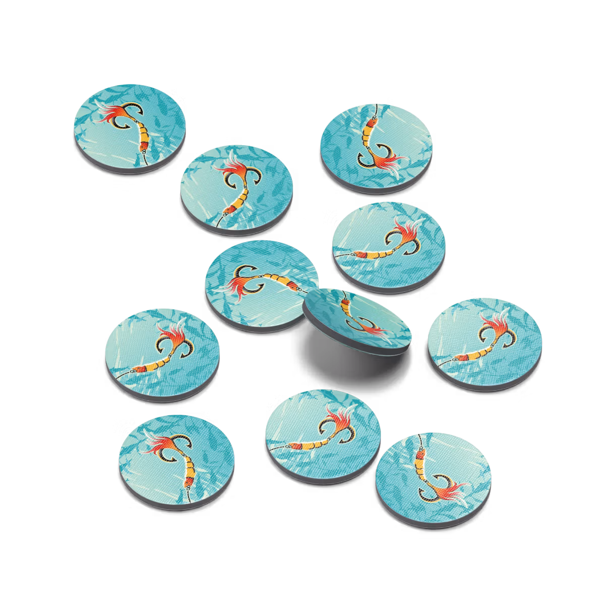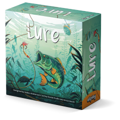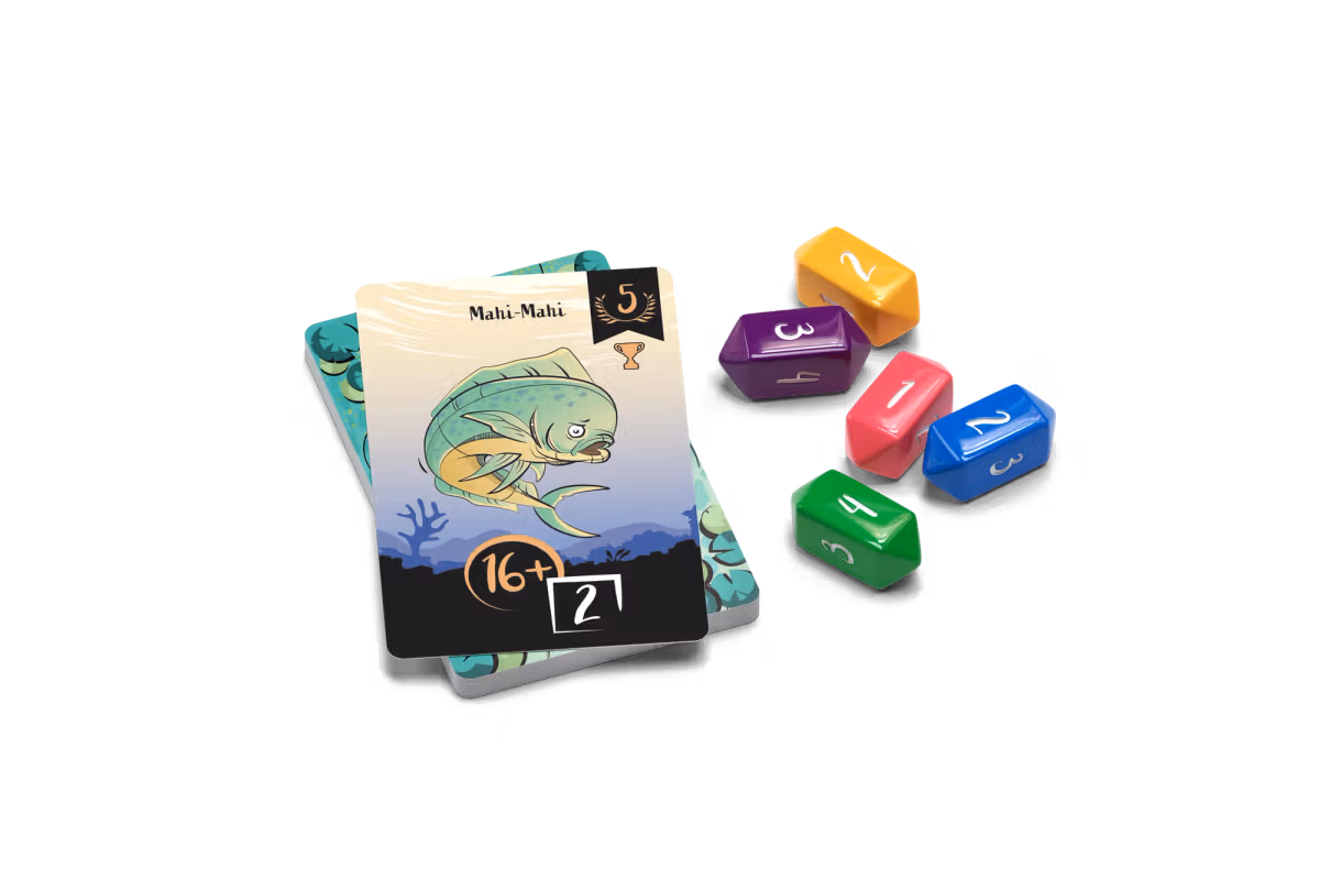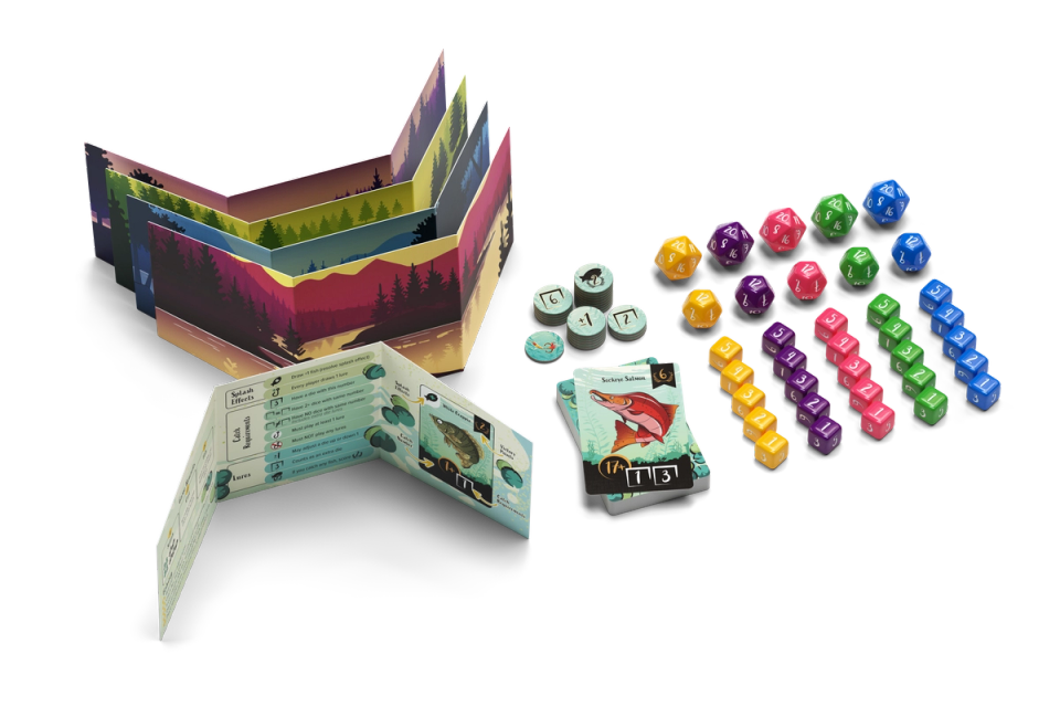 Secretly wager dice behind a player screen. Then, all players reveal their dice simultaneously. If you bid less dice, you get to go first! But, it's easier to catch fish with more dice.Will you play risky to go early, or be patient and catch the big one? Don't forget to use your special dice and lure tokens.Most points (from caught fish) wins!