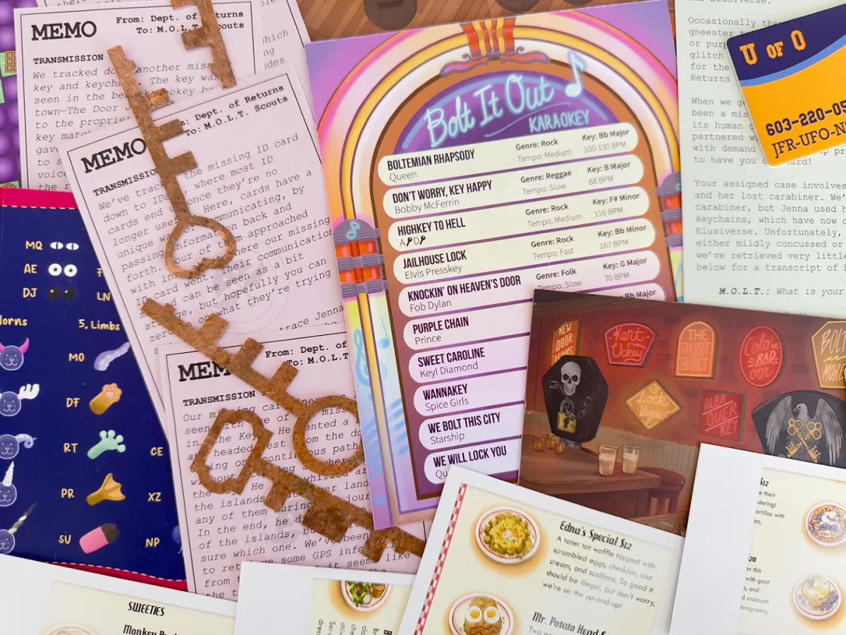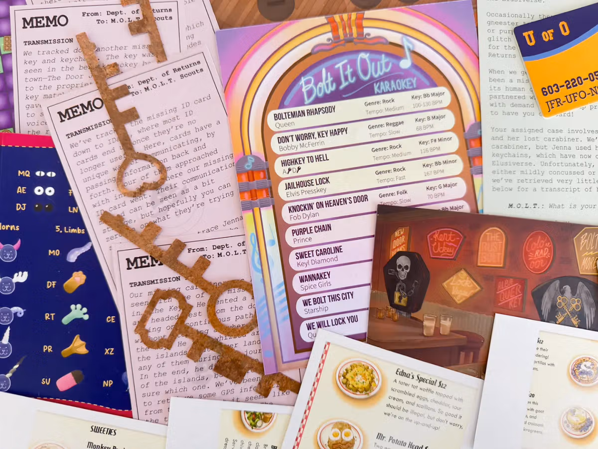 Finders Keypers features five chapters of beautifully-illustrated, whimsical puzzle gameplay. The components include an assortment of journal entries, witness statements, and documents, accompanied by an abundance of odds and ends.Requirements: You will need an internet connected device and a pencil and paper to take notes.