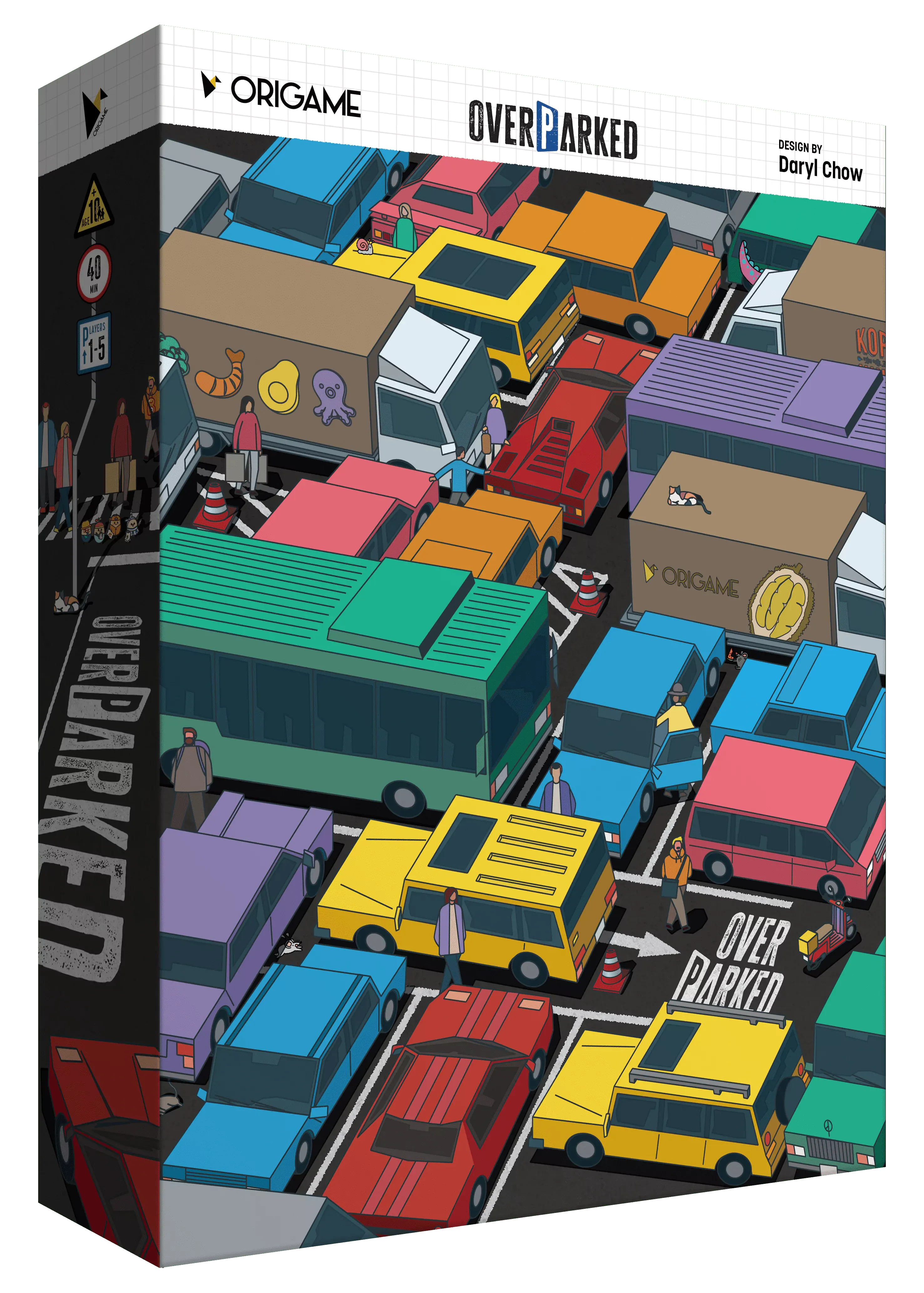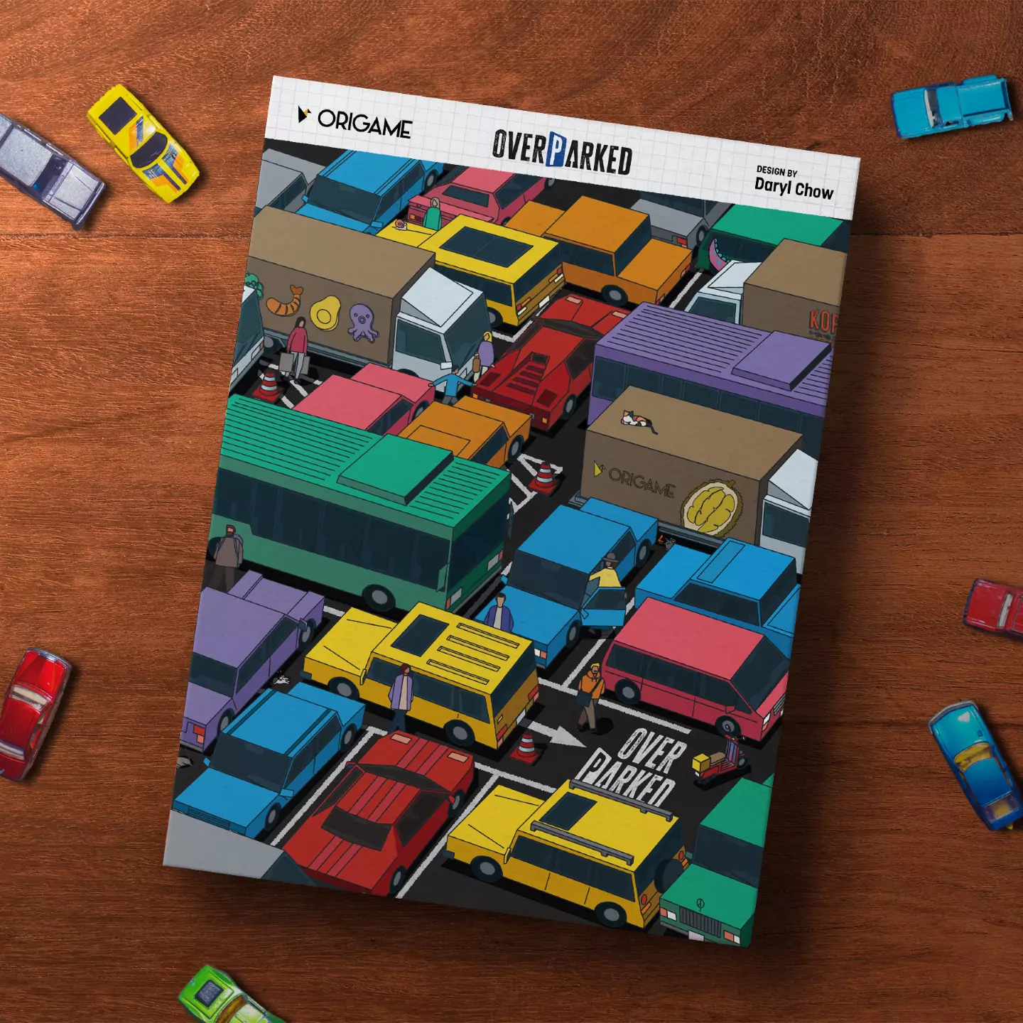 It's concert day, and vehicles are pouring in! Can you manage the traffic by strategically parking to score the most points? Players rotate the steering wheel to determine incoming vehicles, then place them wisely in their parking lots. The game ends when a player runs out of space.From designer Daryl Chow and illustrator TANSAN, Overparked offers a unique puzzle strategy experience!