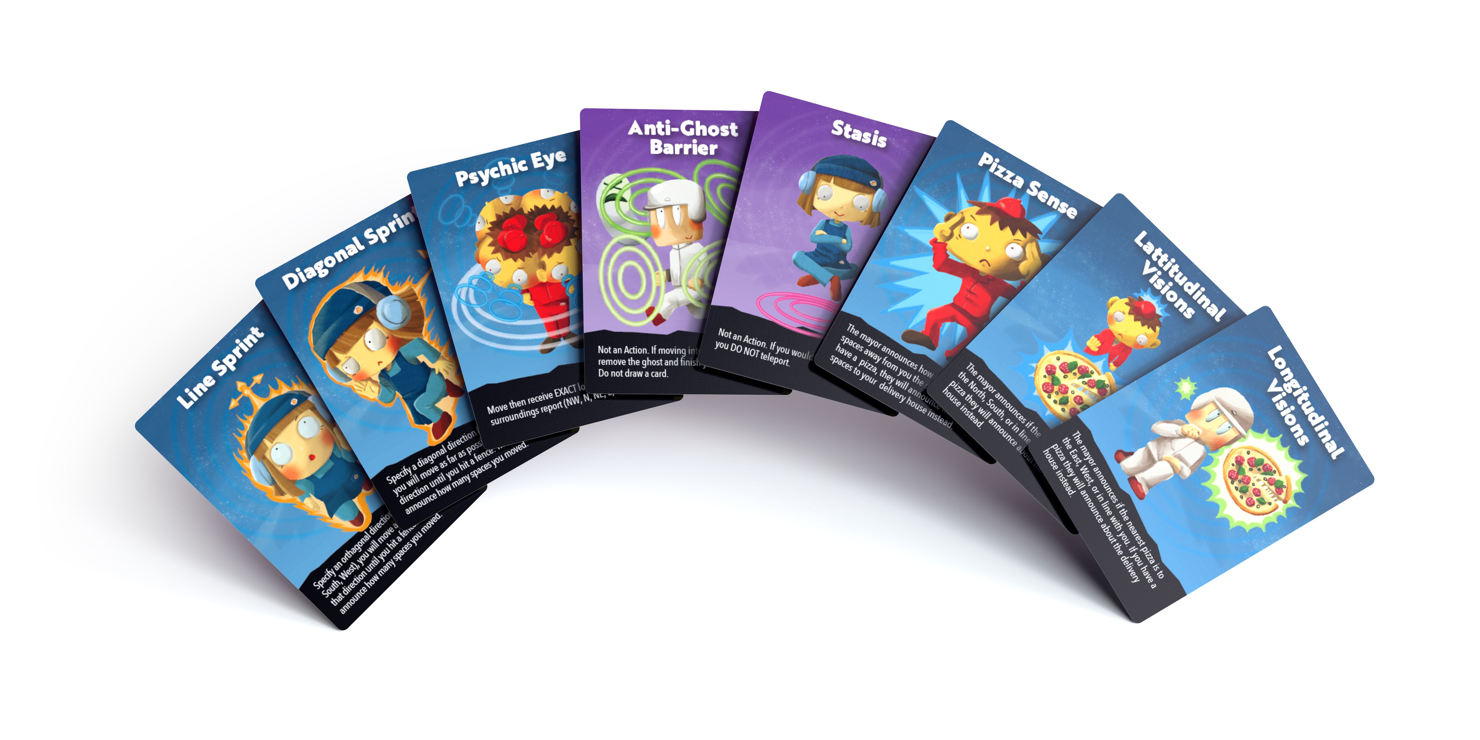 Each deliverer will start the game with special abilities and can earn more as they navigate through the town and banish ghosts. Psychic powers like the "Pizza Sense" or "Psychic Eye" add additional ways to deduce the layout of the ghost town by providing clues as to where the pizza or homes might be located! Wandering around in the dark doesn’t have to be scary!