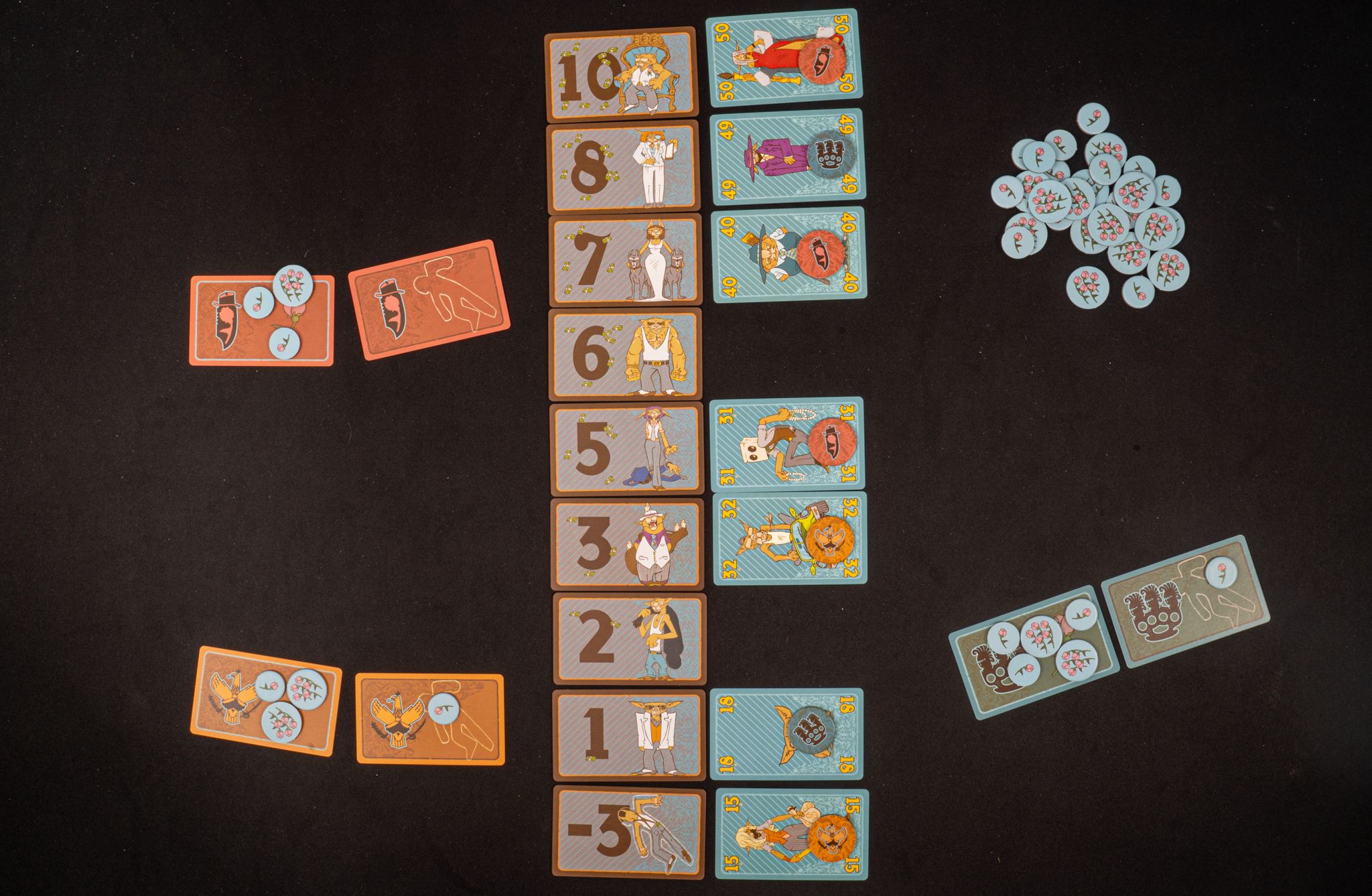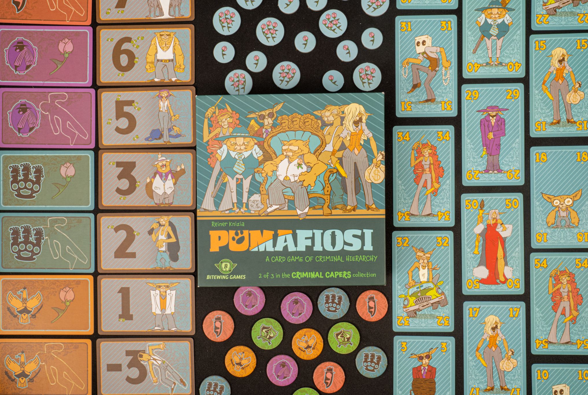 Pumafiosi is a refreshingly unique blend of simple trick-taking and precarious press-your-luck. Each trick, the person who plays the second-highest card wins, and they decide where to place that winning card in the hierarchy. You can even choose to place your measly card at the top of the hierarchy to stake your claim on the big boss points. The catch is that these cards can be knocked down one or more steps on the hierarchy by higher-valued cards, and whoever owns a falling card is penalized!