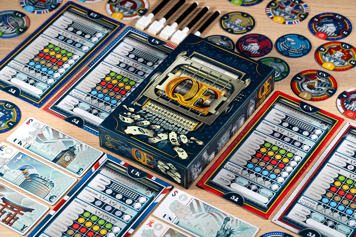 To win the game, you'll need to play the table.QE can play like a classic euro-style auction game with players evaluating the value of each company. Or it can play like a social deduction game with big bluffs, stare downs, and unexpected twists where players hardly concern themselves with the assets they are bidding on. Normally it is somewhere between those extremes.How will it play in your group? Will it change over time?
