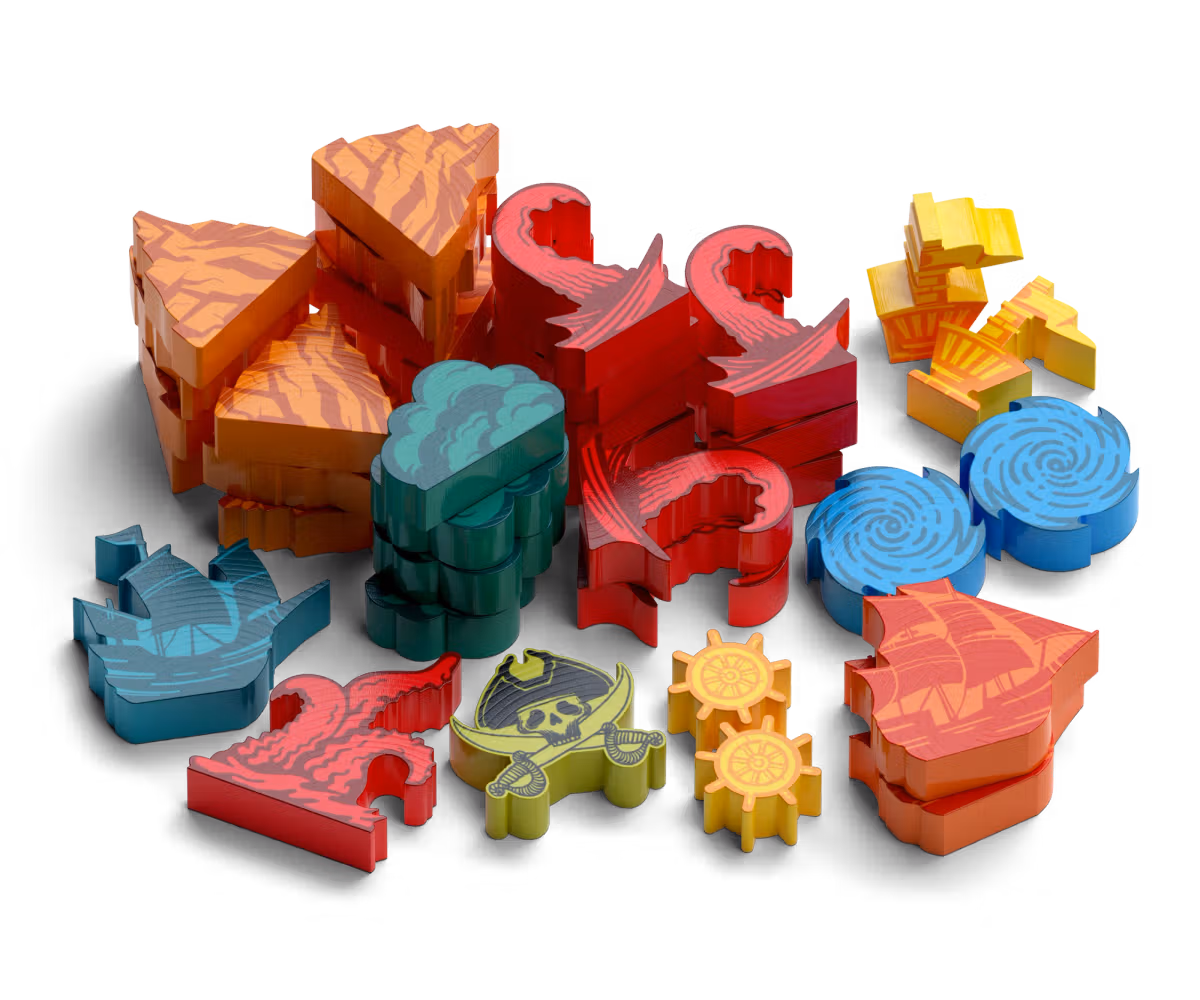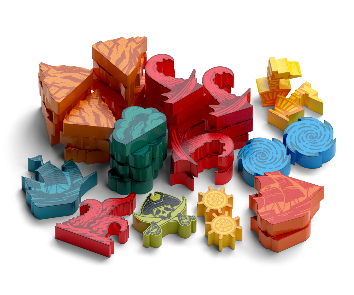 Turn your high-seas adventure 3D with these amazing meeples! These pieces replace many of the tokens on the board.
