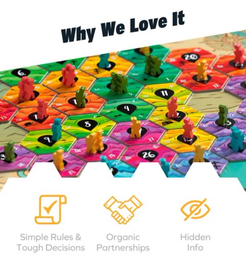 The game’s tough because the players make it tough, not because the rules are confusing–just the way we like it. We love when we can teach a game in a minute and every player (new and experienced) is instantly competitive!Organic Partnerships