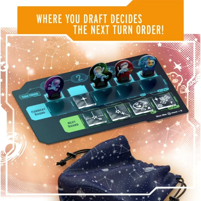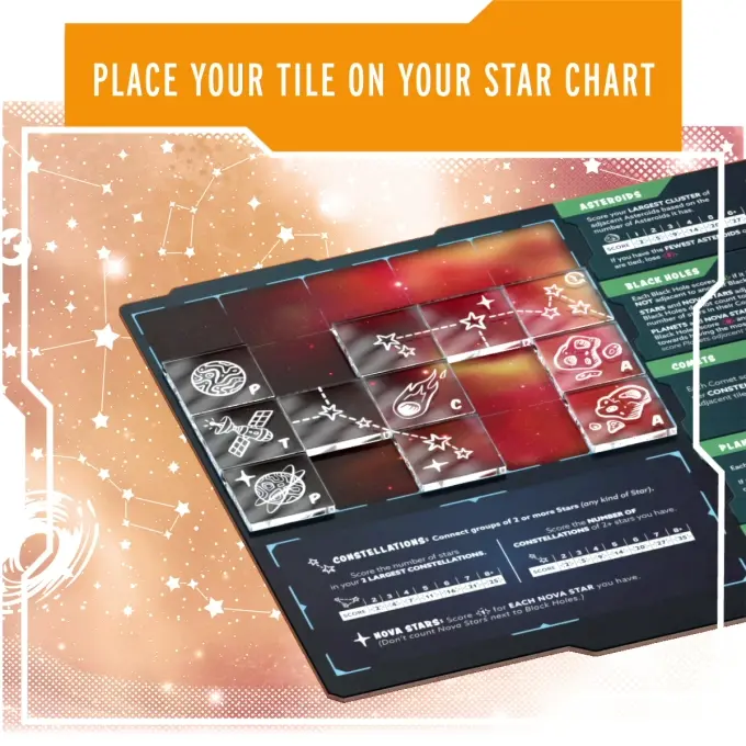 Draft clickity-clackity, transparent tiles to fill your star chart and explore the universe. You'll connect Constellations, build belts of Asteroids, and study your Satellites with the game's modular scoring system. Be careful of those pesky Black Holes—that is, unless you've got the perfect place to put them!