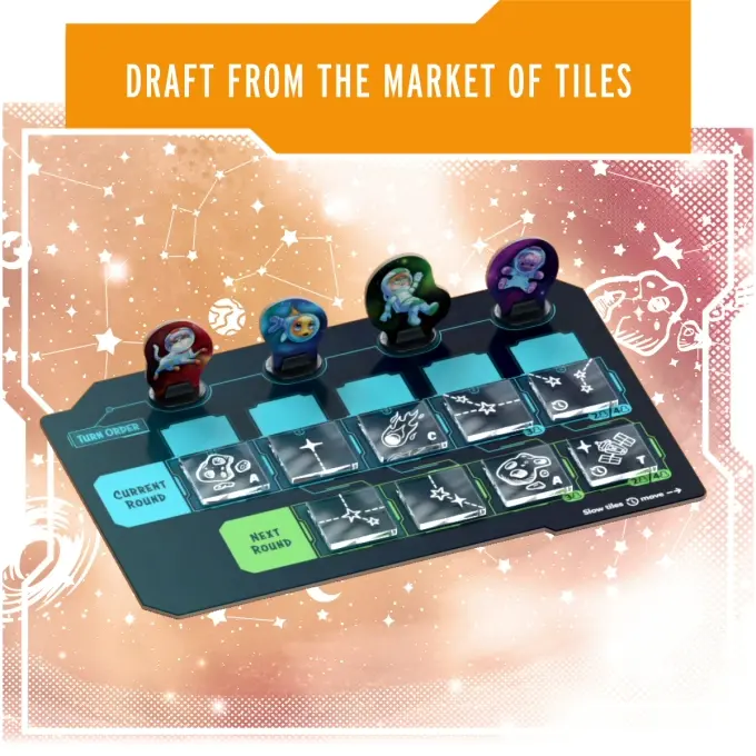 Twinkle Twinkle also features a variable turn order: the tile you draft determines how early you go in the next round. The market shows what's coming next, so plan ahead!