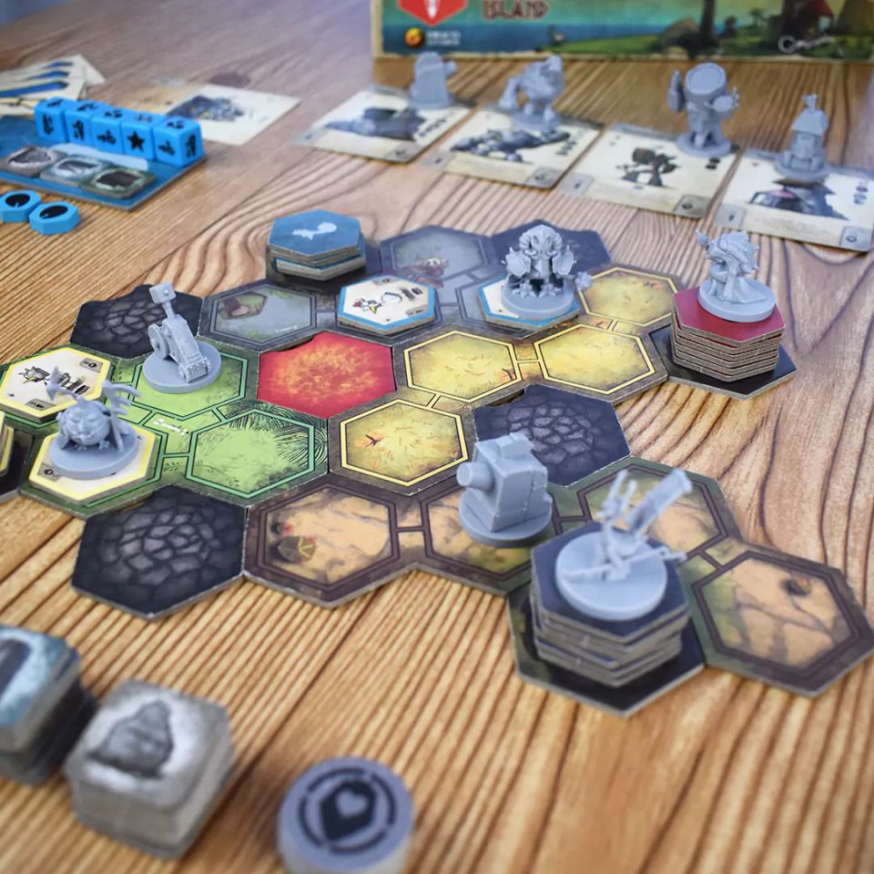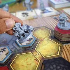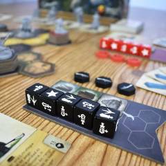 On your turn roll dice, take actions with them, and draw scrolls.Dice represent your leader’s orders: build machines, move, fight, gain resources or activate special abilities.In combat, dice with bonus are assigned first. Then, all players may play cards face down to support either side and benefit from the outcome.Beware! Catastrophes alter the state of the board.