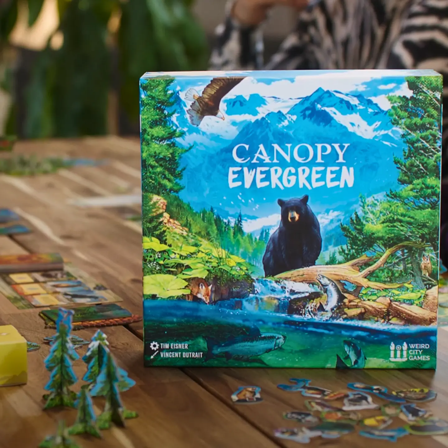 In Canopy: Evergreen, players draft cards to grow towering trees, collect wild plants, and build thriving habitats in the Pacific Northwest. Choose from three growth piles each turn, take what's there or let it grow. With new mechanics like food collection, forest boards, and 3D tree tokens, this standalone game offers strategic set collection and lush, ever-changing gameplay.