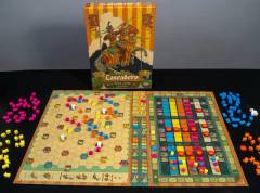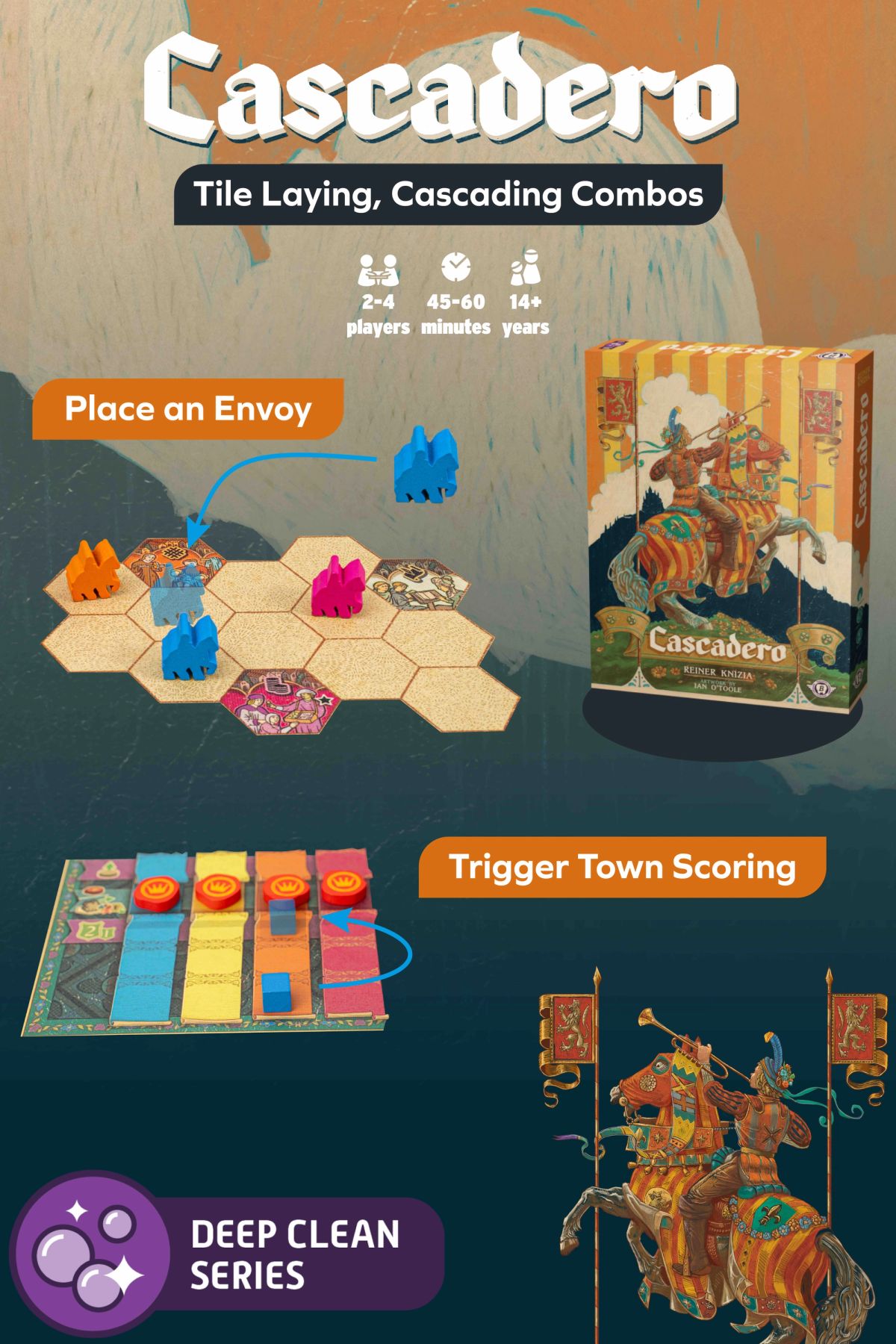 Cascadero is the next epic tile placement strategy game from acclaimed designer Reiner Knizia. Ministers visit towns by placing their envoys adjacent to them; but towns are distrustful of single envoys, so newly placed envoys will only trigger town scoring when they are part of an established group or carry an official seal from El Cascadero himself. Towns with Royal Heralds at them or a history of envoy visits are even more valuable, as they willingly collaborate for even greater successes. Use your wits to rack up successes as you compete to become El Cascadero’s favored minister!