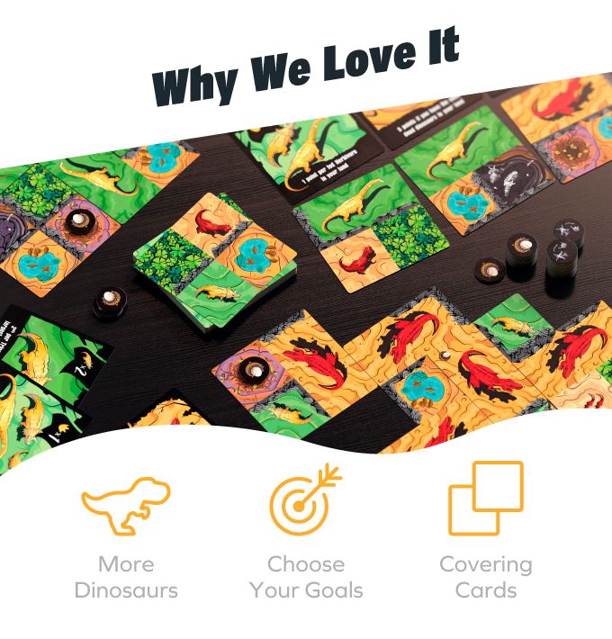 Chomp is a quick game where you only get eight turns. Make the most of them! Every card in the game has a point-scoring goal on one side and a dinosaur landscape on the other side.