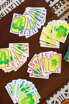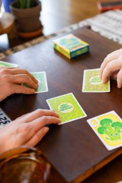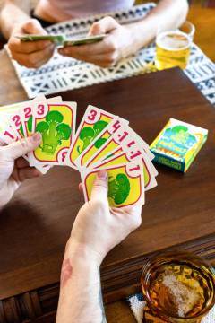 In Don't Botch the Broccoli, players have a hand of broccoli cards and simultaneously play one each turn. Players who play the same number move their card to their steamer, then whoever played the lowest remaining card gets to cook their broccoli, scoring it and any cards in their steamer. All other cards are botched and return to their owner's hand.
