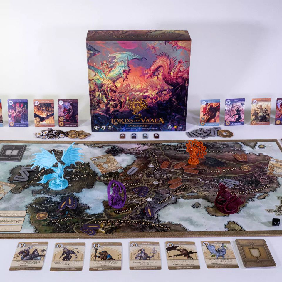 This base game includes 2 Dragons and 2 Generals (miniatures), 5 custom dice, 106 cards, 143 tokens, 1 large game board, and 4 player mats.