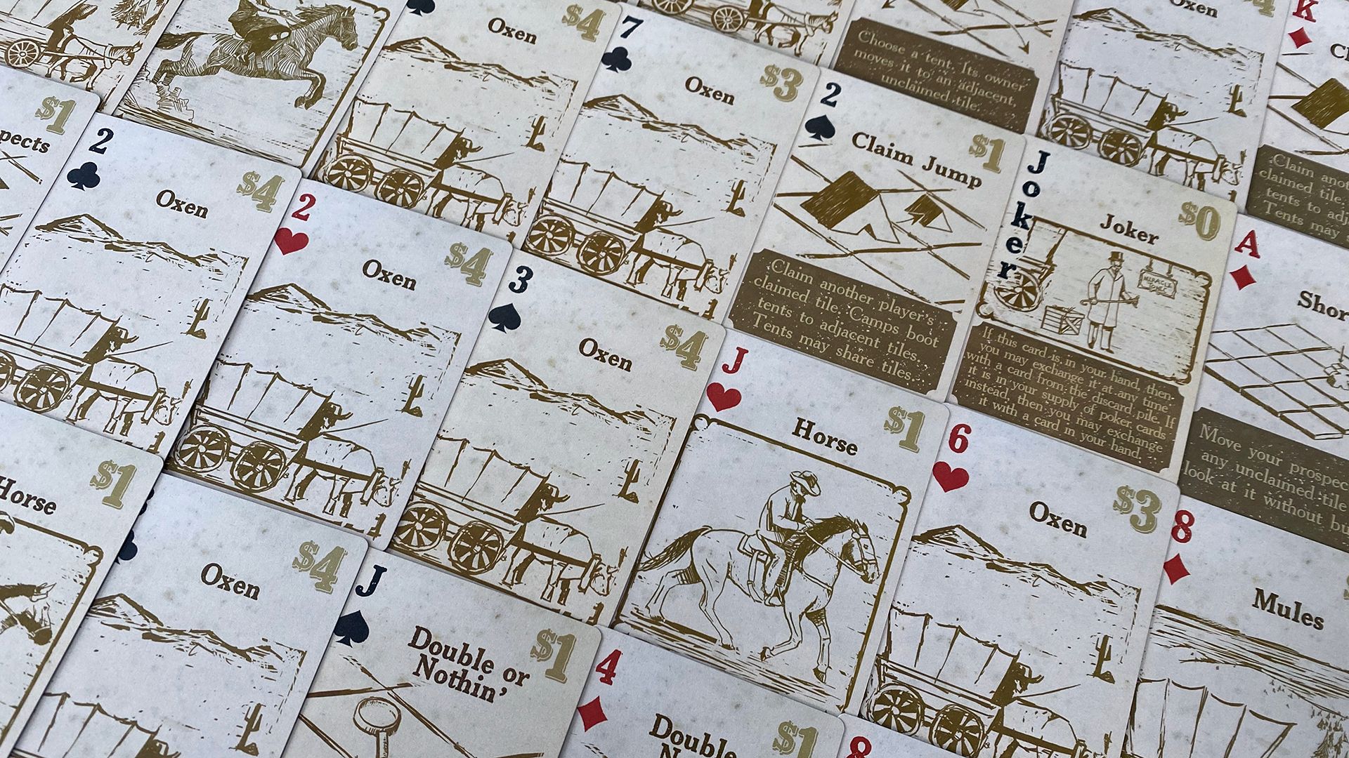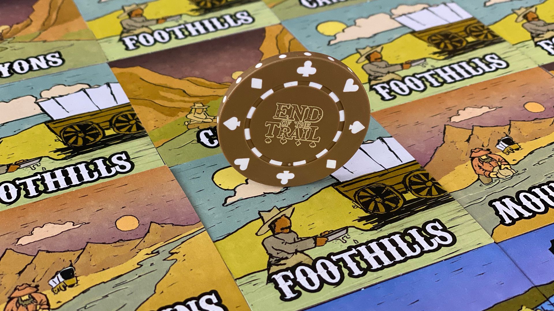 End of the Trail is a competitive card game for 1-4 prospectors and fortune seekers. Players manage a hand of cards to secure transportation, prospect land, and take a shot at winning a title to more land at the poker table. Cards have three uses, each corresponding to a particular phase of the game: to prospect land tiles and discover how much gold a claim will produce, to collect and play cards that build a good poker hand, and to purchase additional cards in auction to help with prospecting, poker, or both.