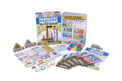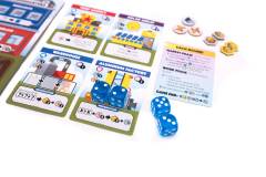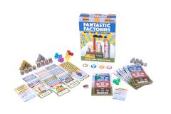 Fantastic Factories contains double layered player boards, cards, tokens, and 6 sided workers (dice).