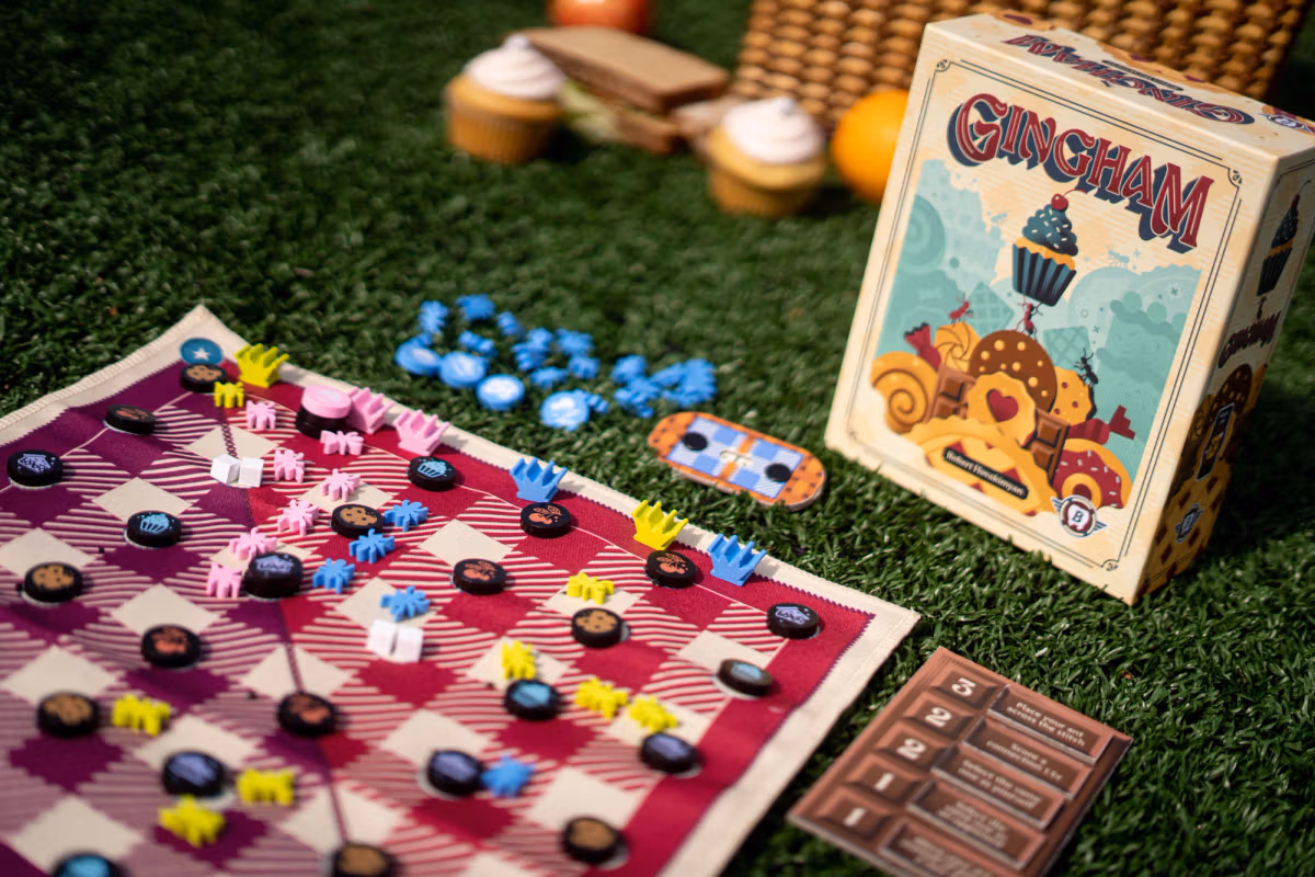 In Gingham, players position their queens around the gingham picnic blanket and deploy their ants to connect sweets and claim the stockpiles they create. Stretch your ants across the blanket, and grab the biggest piles of sweets to prove your pint-sized royalty! Gingham is the second title in Bitewing Games' Travel Line. This line of games is focused on being supremely easy to play with anyone, anywhere.