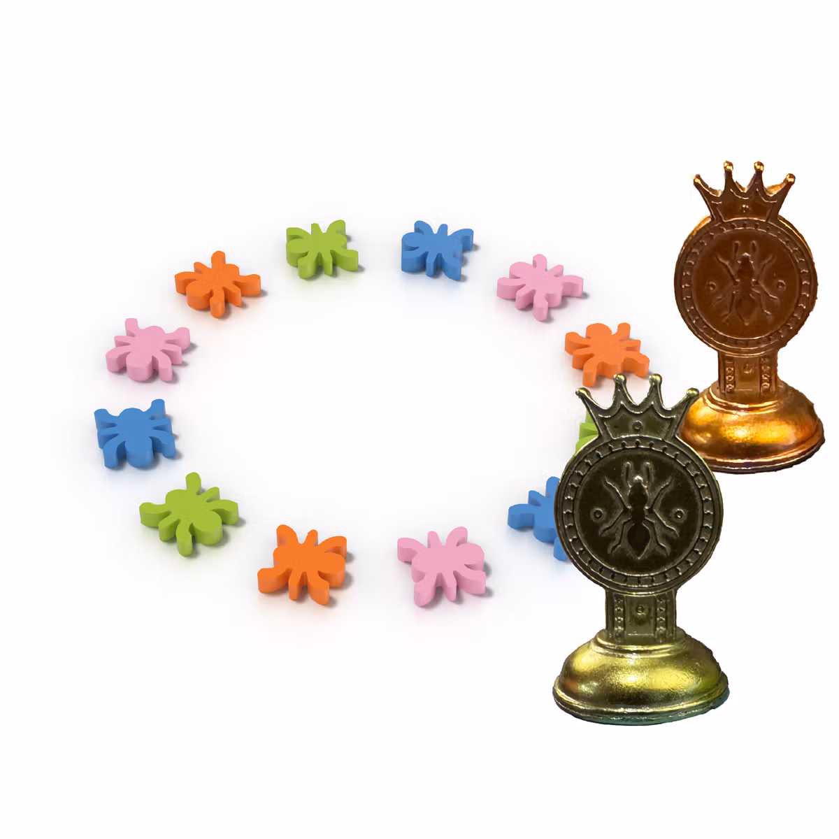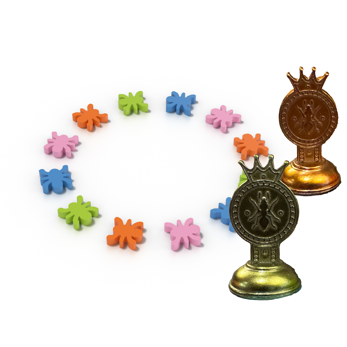 Upgrade your 8 wood queen pieces to hefty metal pawns. Upgrade all 104 ants from punchboard tokens to chunky wood critters.