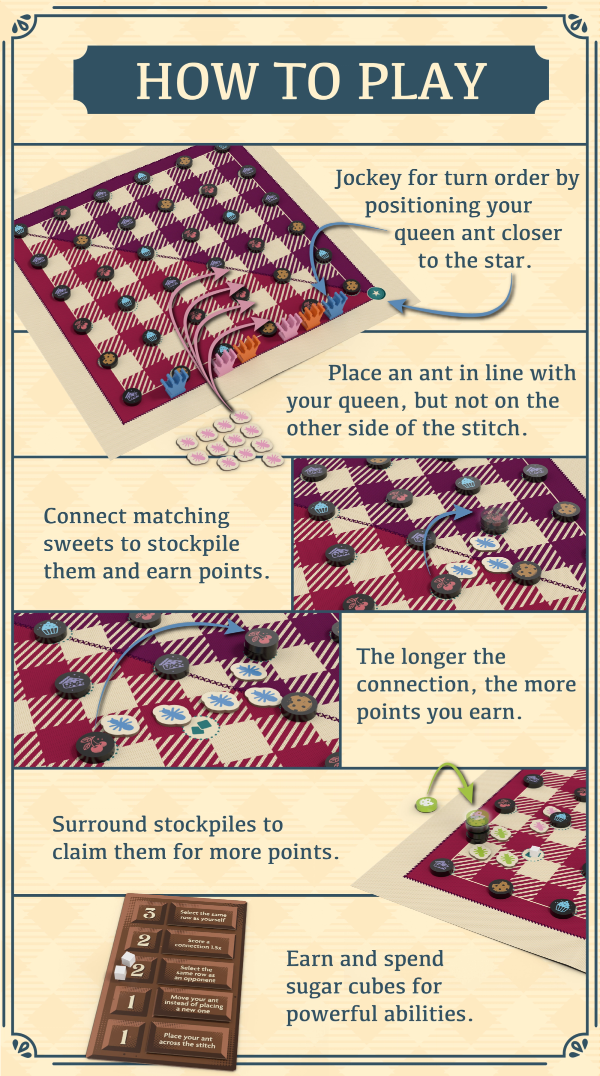 Players are racing to connect matching sweets to score big points. Can your ant colony snatch up that valuable cupcake before your rivals assemble their chain? By fully surrounding a sweet token or stack, you can claim it as your own stockpile for major scoring. But it’s possible for another player to steal your stockpile if they can surround your stockpile, and that’s even easier to accomplish if they can carry your stockpile away with a clever connection of ants.