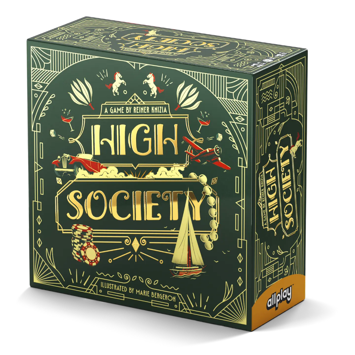 In High Society, you and up to 4 of your high-roller friends will flaunt your wealth to cement your place in the upper crust. Bid on luxuries like exquisite jewels, vintage wine, or the grand opera to increase your reputation. But, watch out for scandals!At the end of the game, whoever has the least money is cast out of high society and cannot win (even if they scored the most points!).This edition of High Society is modernized and reprinted in Allplay's signature small box. New Knizia-designed cards have been added--including an auction where all players bid blindly and a card that doubles your money before elimination.With classy illustrations and shimmering spot foiling on the box and cards, this is the definitive version of the timeless auction classic.