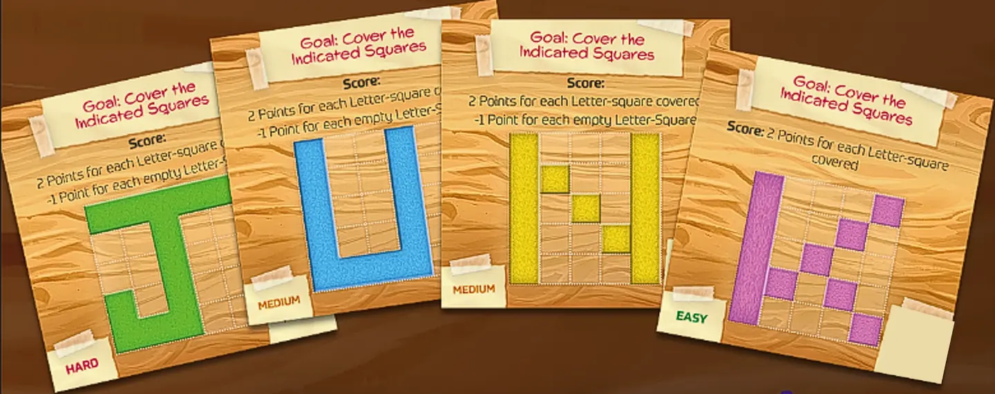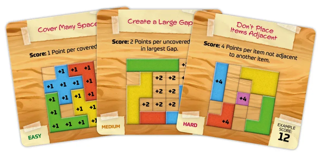 Comes with 4 player boards, 4 sets of 21 uniquely shaped polyominos, and 24 scoring goals
