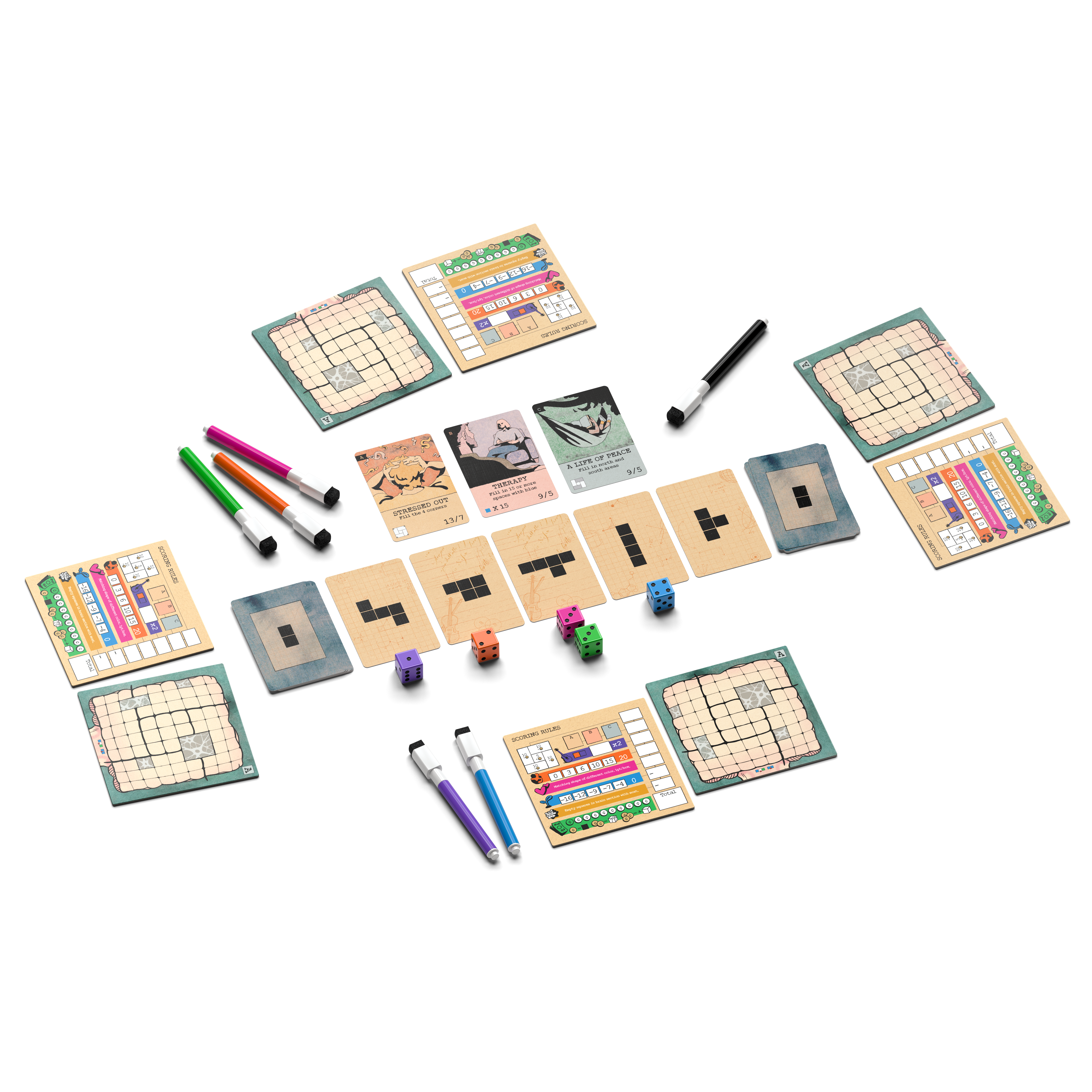 Five pursuit (polyomino) cards are available each round. You roll five dice to assign colors to those shapes. Then, you have to decide which shape to draw on your brain board.