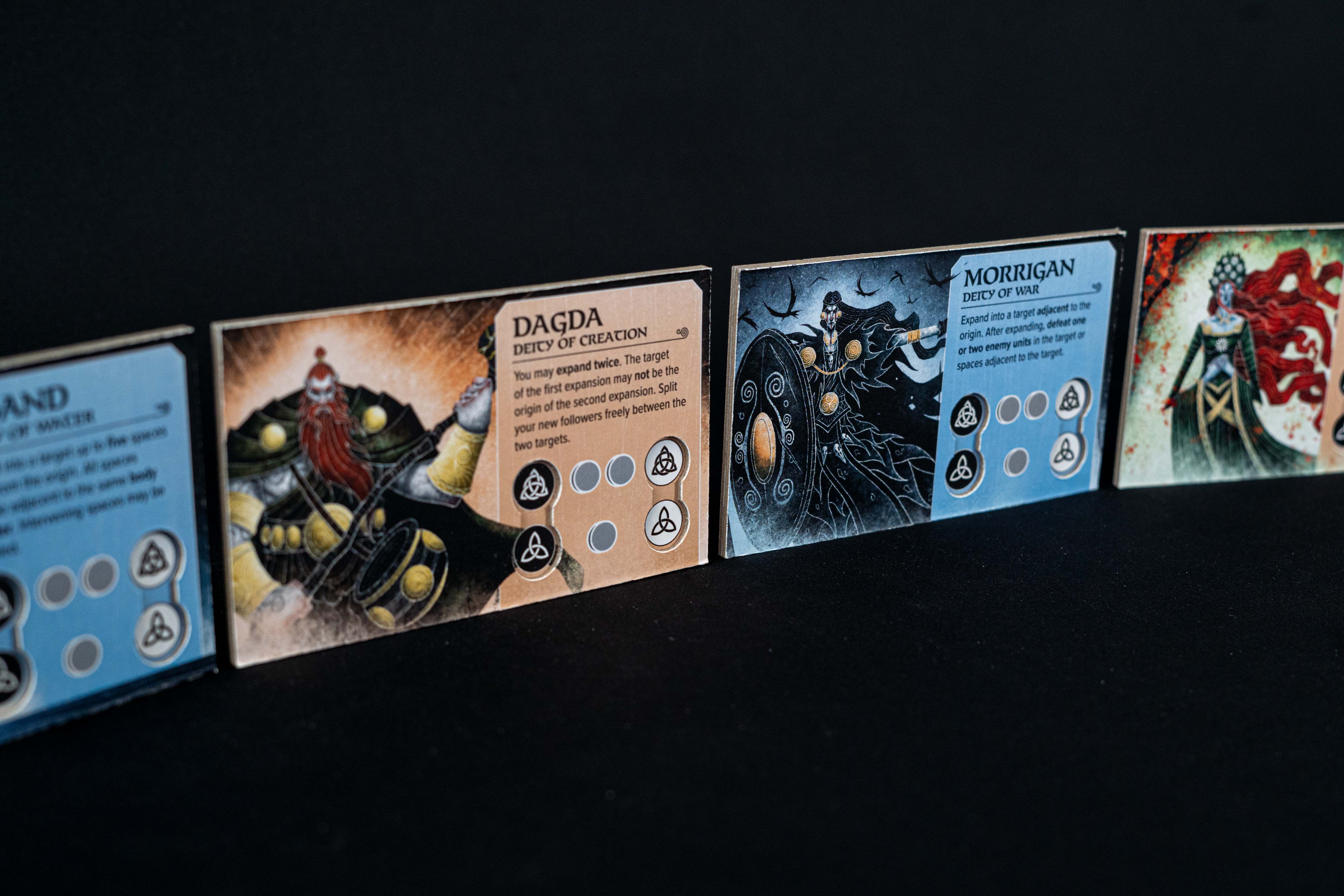 In Moytura, you and your opponent command competing factions of the Tuatha Dé Danann, but you are not the only ones struggling for control of ancient Ireland. Three enemy clans act together as a third opponent faction that competes with the players and scores points.