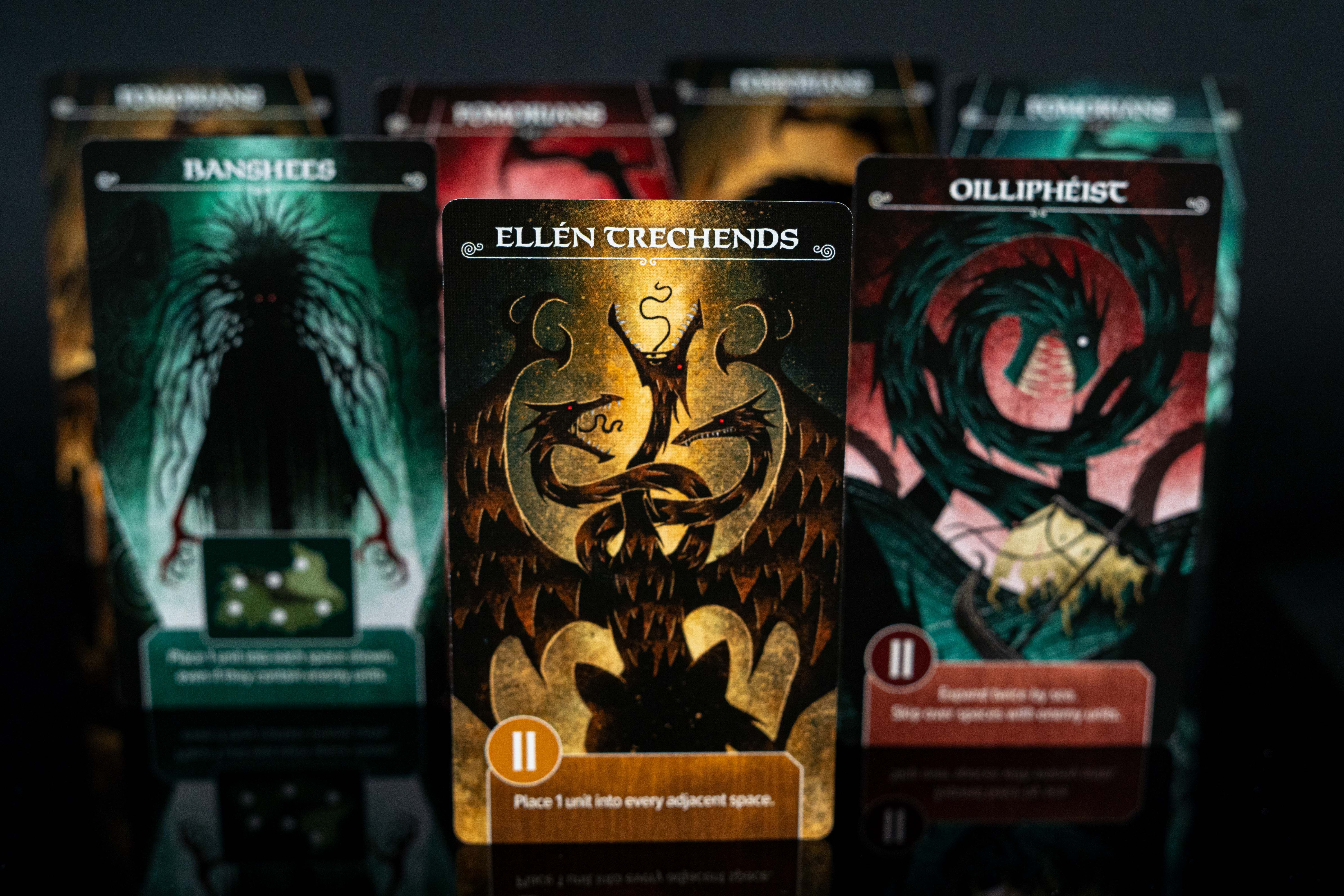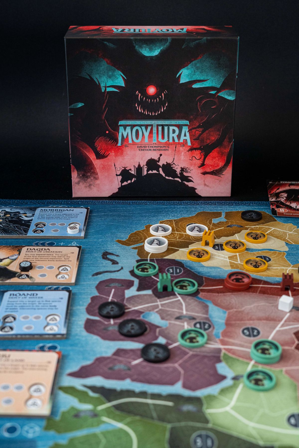 Area majority games tend to thrive only at high player counts. Moytura innovates on the genre by introducing a smooth and simple non-player enemy that functions as a third faction — it even competes with the players for points! If you’ve played Pandemic before, the system is very similar, where an enemy card is revealed and dictates where and how an enemy clan expands across the map. Players must compete against each other and the enemy faction, sometimes even cooperating to bring down the enemies when they threaten to take over.