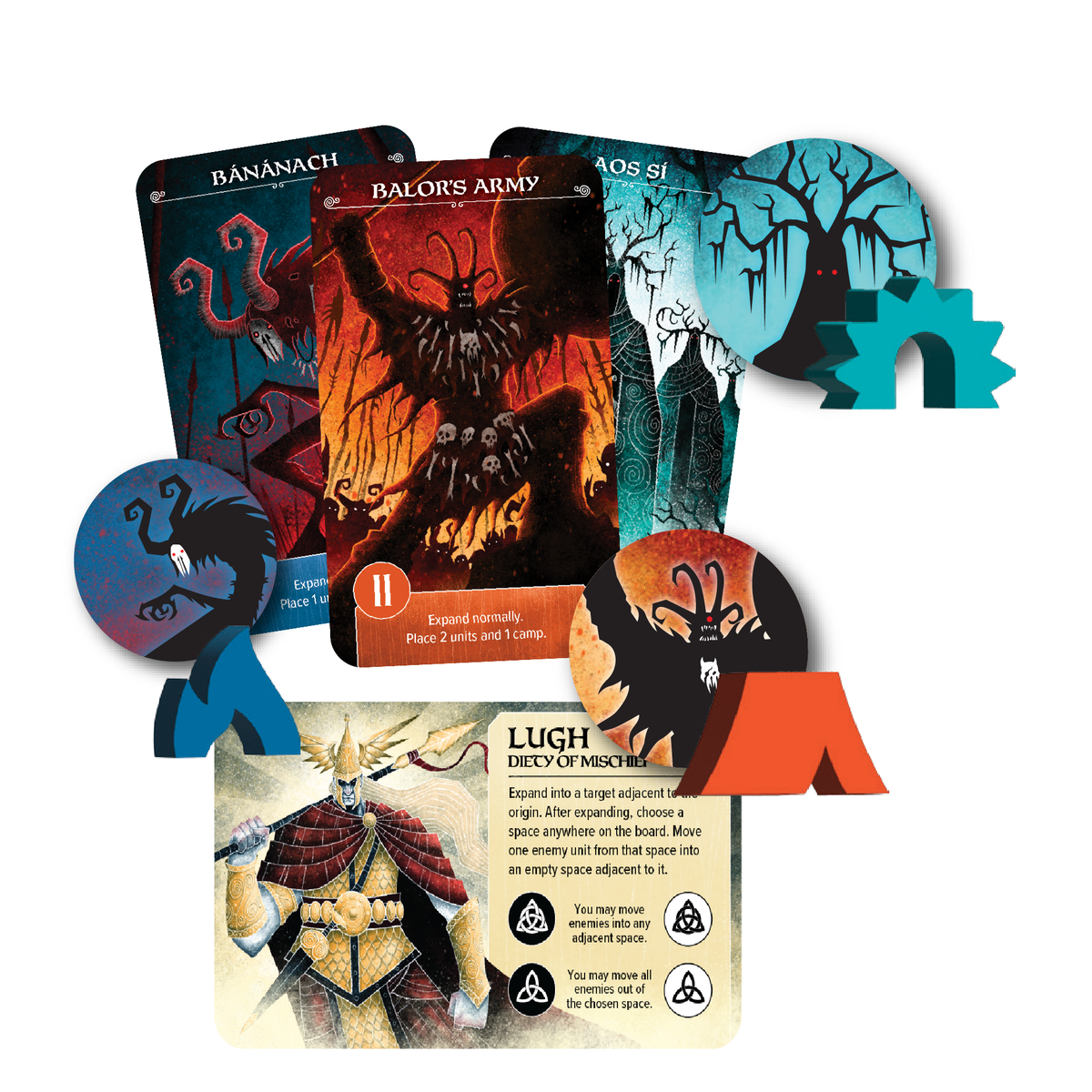 - 3 new enemy clans: the Bánánach (Battlefield Haunts), Balor’s Army (King of the Fomorians), and the Aos Sí (People of the Otherworld). Each utilize new tokens that permanently affect the board in new ways, such as adding permanent influence or creating new opportunities for scoring.