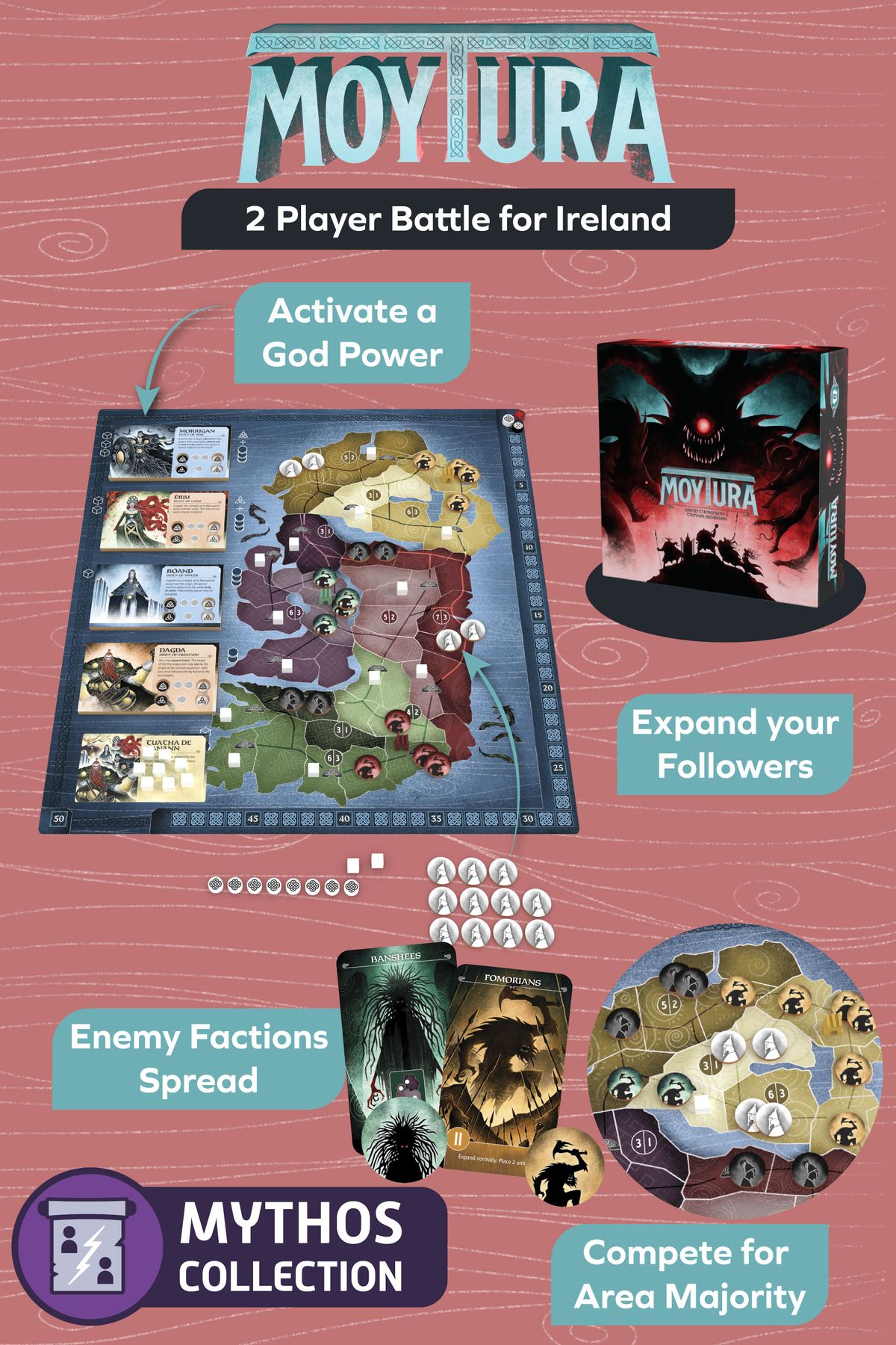 In Moytura, you and your opponent command competing factions of the Tuatha Dé Danann, but you are not the only ones struggling for control of ancient Ireland. Three enemy clans act together as a third opponent faction that competes with the players and scores points. Points are gained by having the most influence across Ancient Ireland at the end of each era. Within each of the eleven regions, the faction with the most or second most units across all the spaces of a region will score the indicated points. Only the player who cleverly outmaneuvers their opponent while carefully keeping the enemy faction in check will be able to secure the victory.