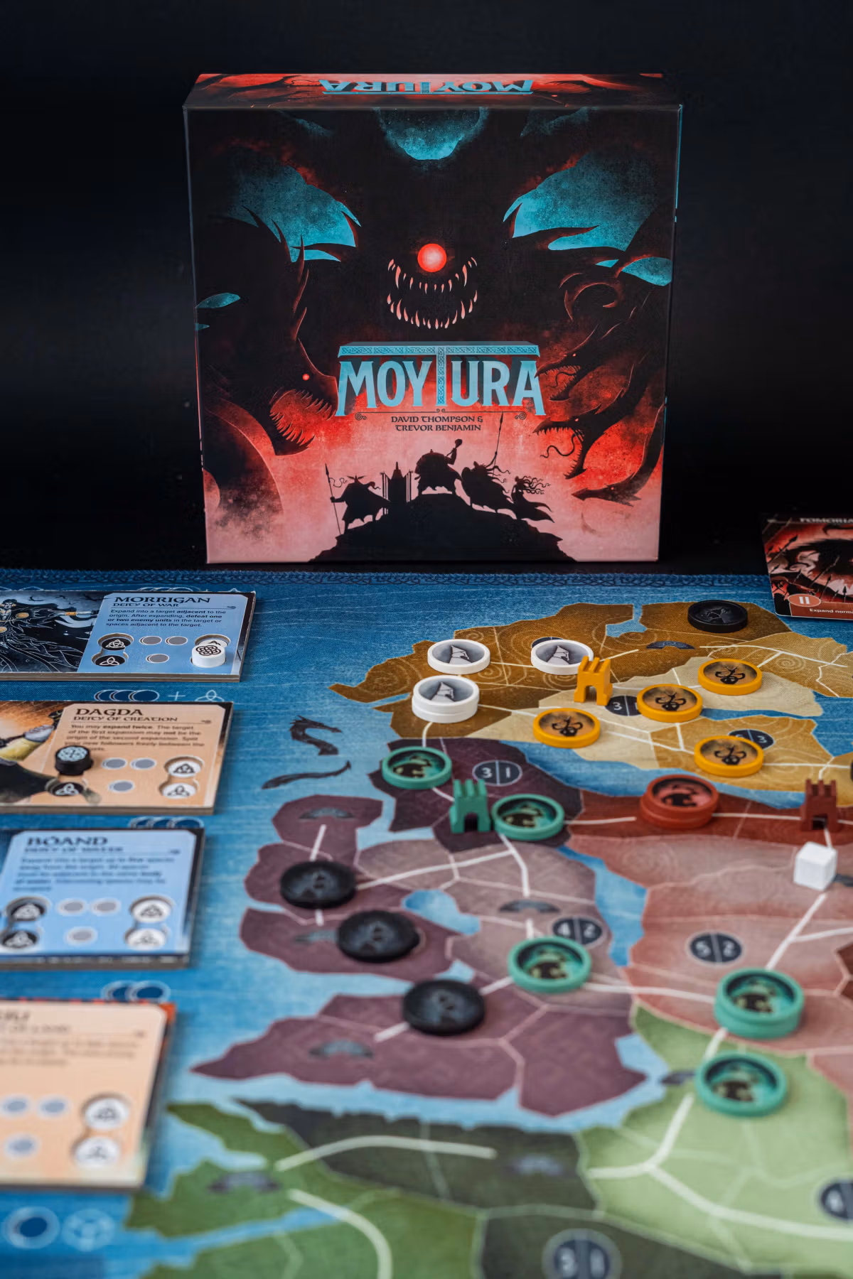 In Moytura, you and your opponent command competing factions of the Tuatha Dé Danann, but you are not the only ones struggling for control of ancient Ireland. Three enemy clans act together as a third opponent faction that competes with the players and scores points. Points are gained by having the most influence across Ancient Ireland at the end of each era. Within each of the eleven regions, the faction with the most or second most units across all the spaces of a region will score the indicated points. Only the player who cleverly outmaneuvers their opponent while carefully keeping the enemy faction in check will be able to secure the victory.