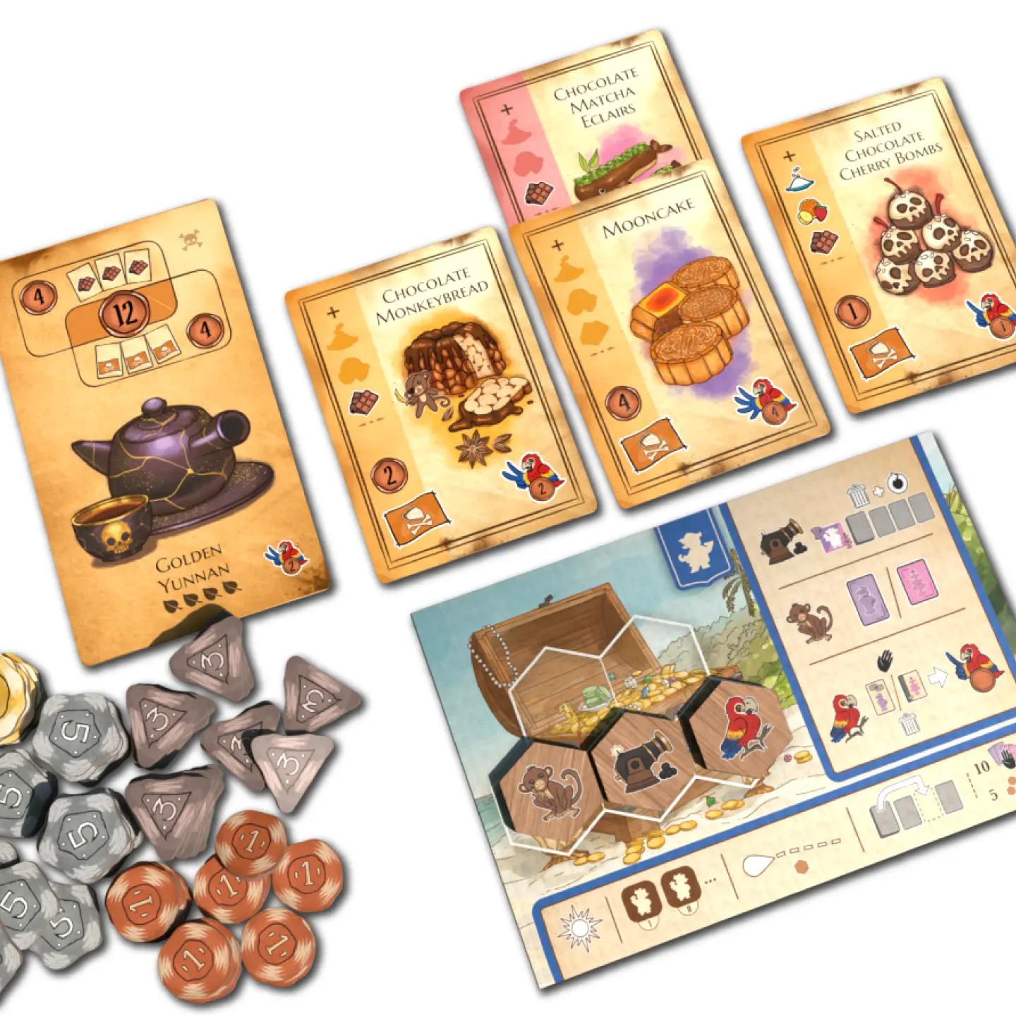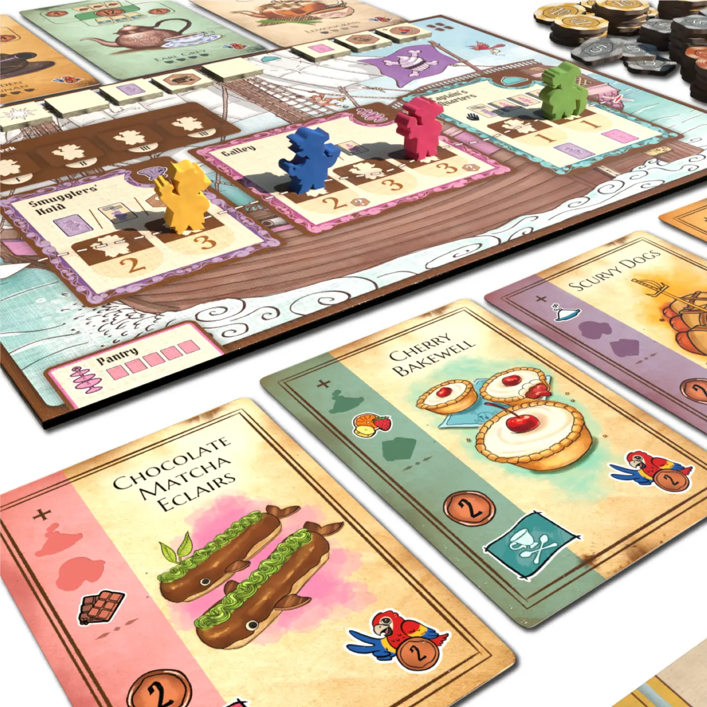 Compete against your fellow pirates, strategically deploying to collect the most delicious dishes and teas from across the ship. Send your monkey to sneak food from the pantry, your parrot to smuggle tea directly to the Captain, or use your cannon to blow it all up! When it comes time to serve the Captain, smash dishes together to make the perfect meal that is sure to win the Captain’s treasure.