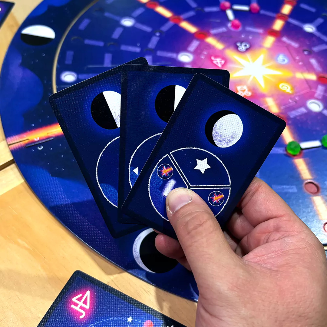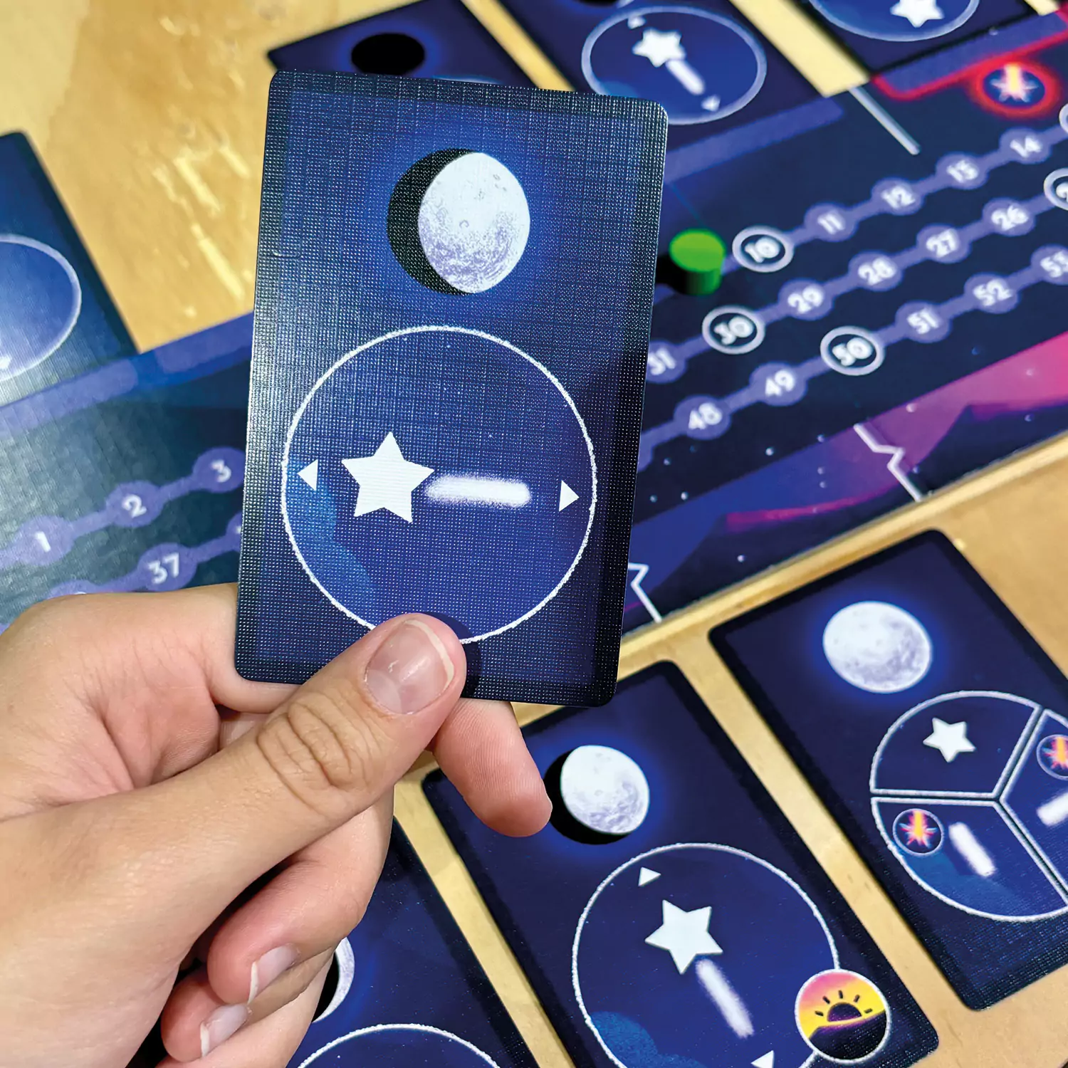 Moon phases circle around the night sky, dictating where cards and stars can be played and which goals are scored.