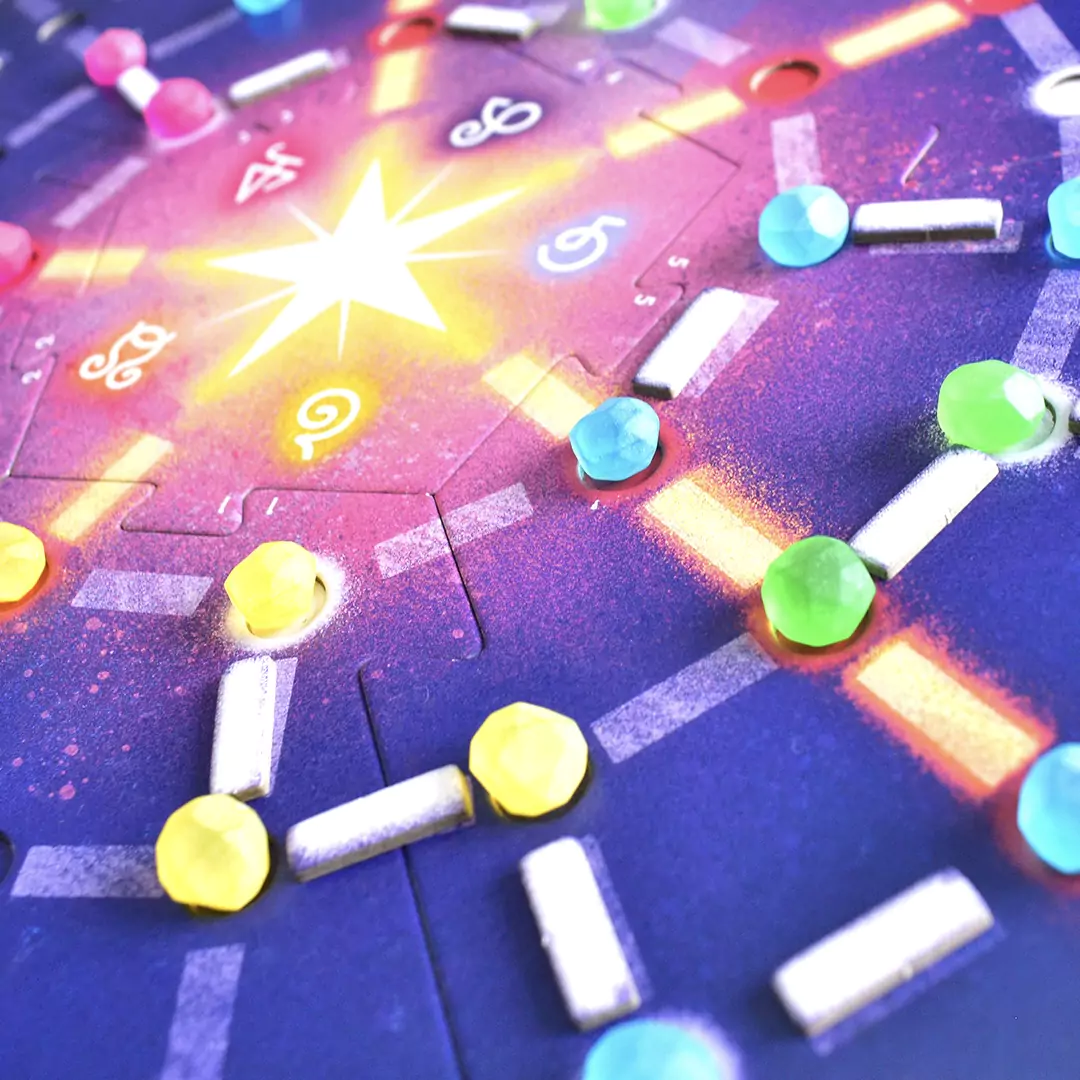 Place Stars in a double-layered board to form constellations and fulfill objectives in 5 rounds. The rotating moon board determines where to place them. Get the most Victory points to win.