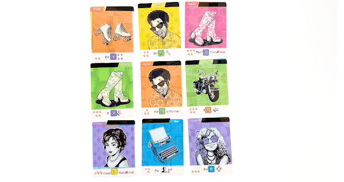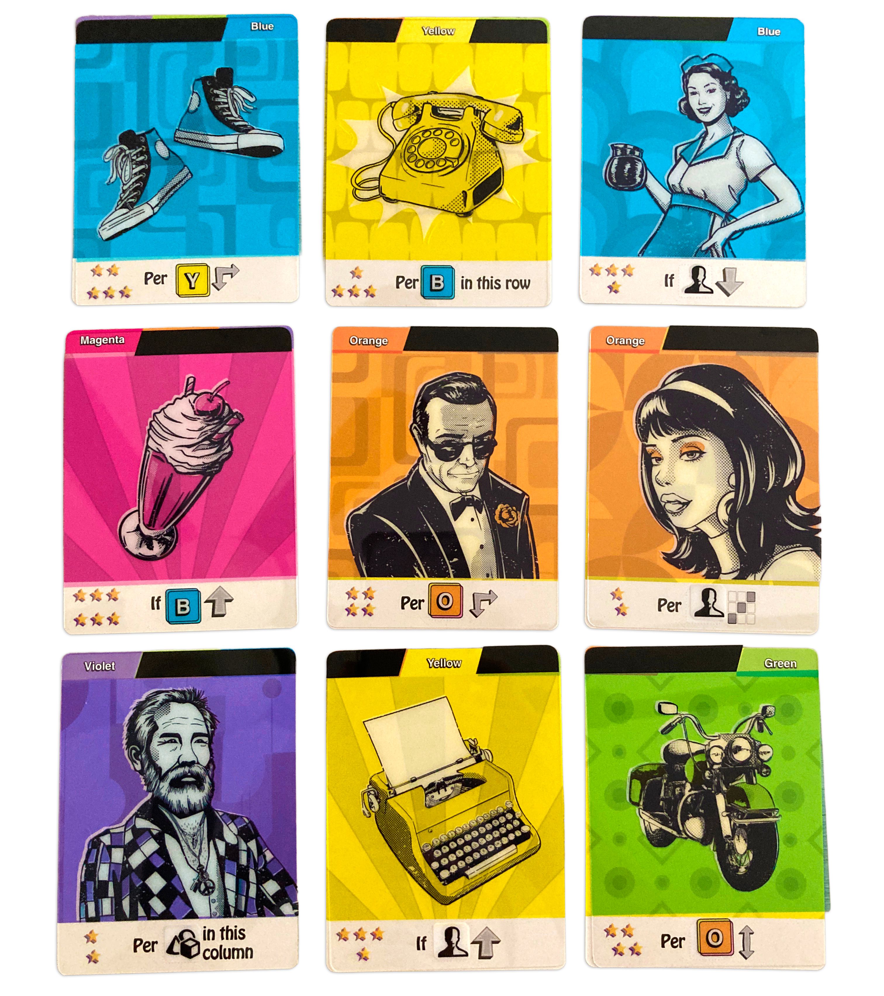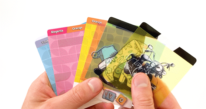 Each turn, combine cards from your hand and add them to your 3x3 grid. Layering a foreground card on a background card blends their colors. Depending on which cards you layer together, you'll also craft unique goals that score your prints’ colors or illustration types. Then pass your remaining cards to the player on your left. Once everyone completes their tableaus, the game ends.