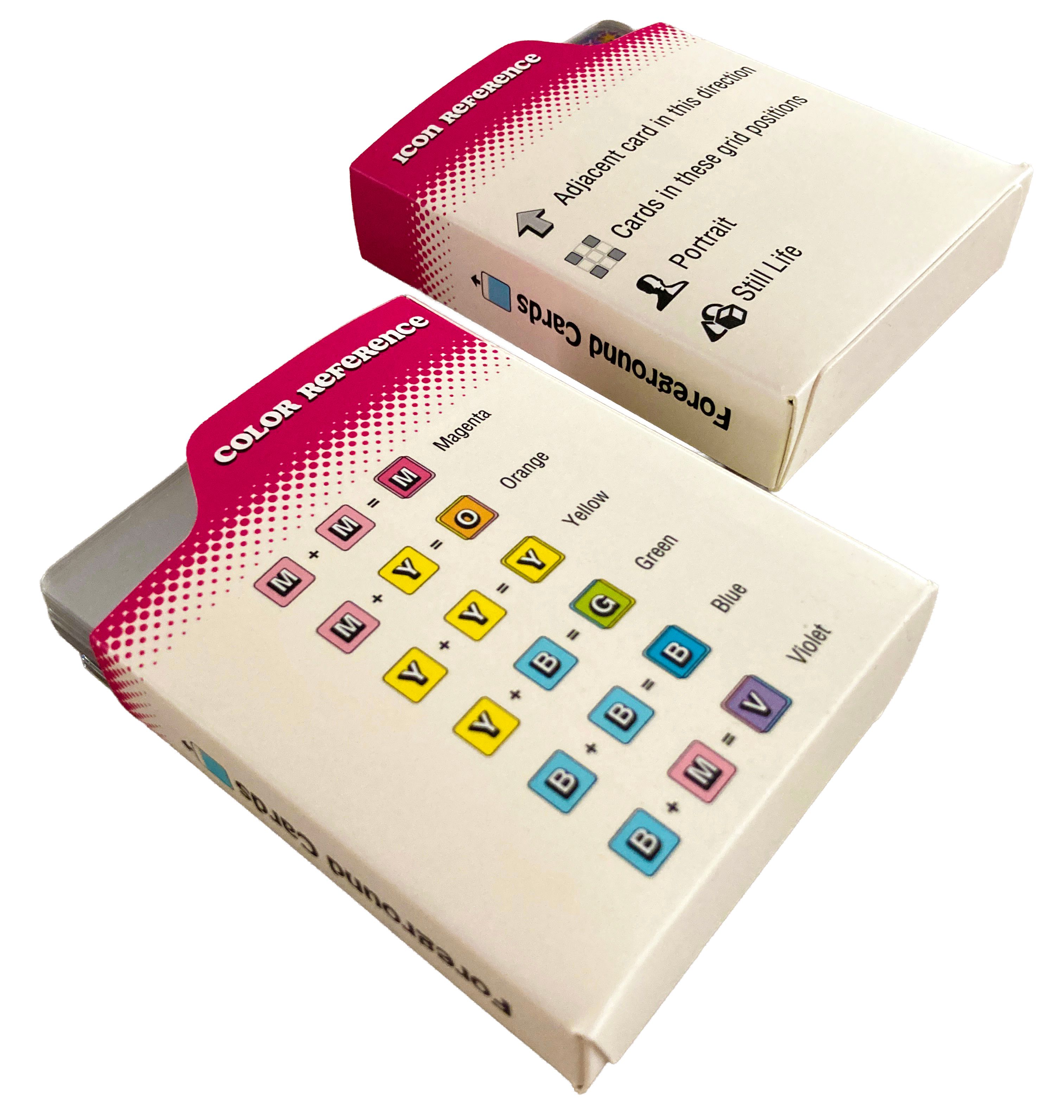 Pick 1 Foreground Card and 1 Background Card from your hand. Add the print to your tableau. Try to create goals that score your other prints' colors and illustration types.