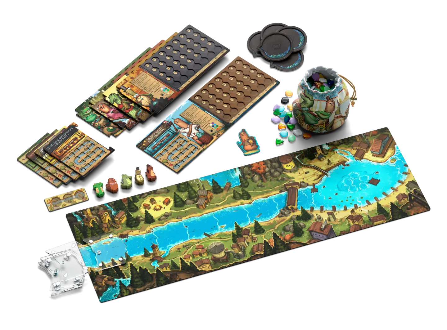 Get the deluxe edition for a unique Spot UV + Gold Foil box, neoprene playmat, acrylic river tiles, deluxe stand-up bag, dual-layer boards, and screen-printed meeples!