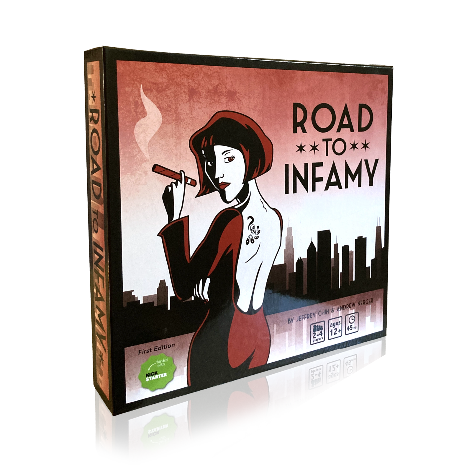 Road To Infamy is a crime-themed board game for 2-4 players. You are a wealthy gang leader competing to run the most infamous crime operation in Chicago. You will place bids on the black market to recruit gangsters with unique abilities, buy contraband to become more infamous, and bribe the cop to protect your goods and sabotage your rivals.