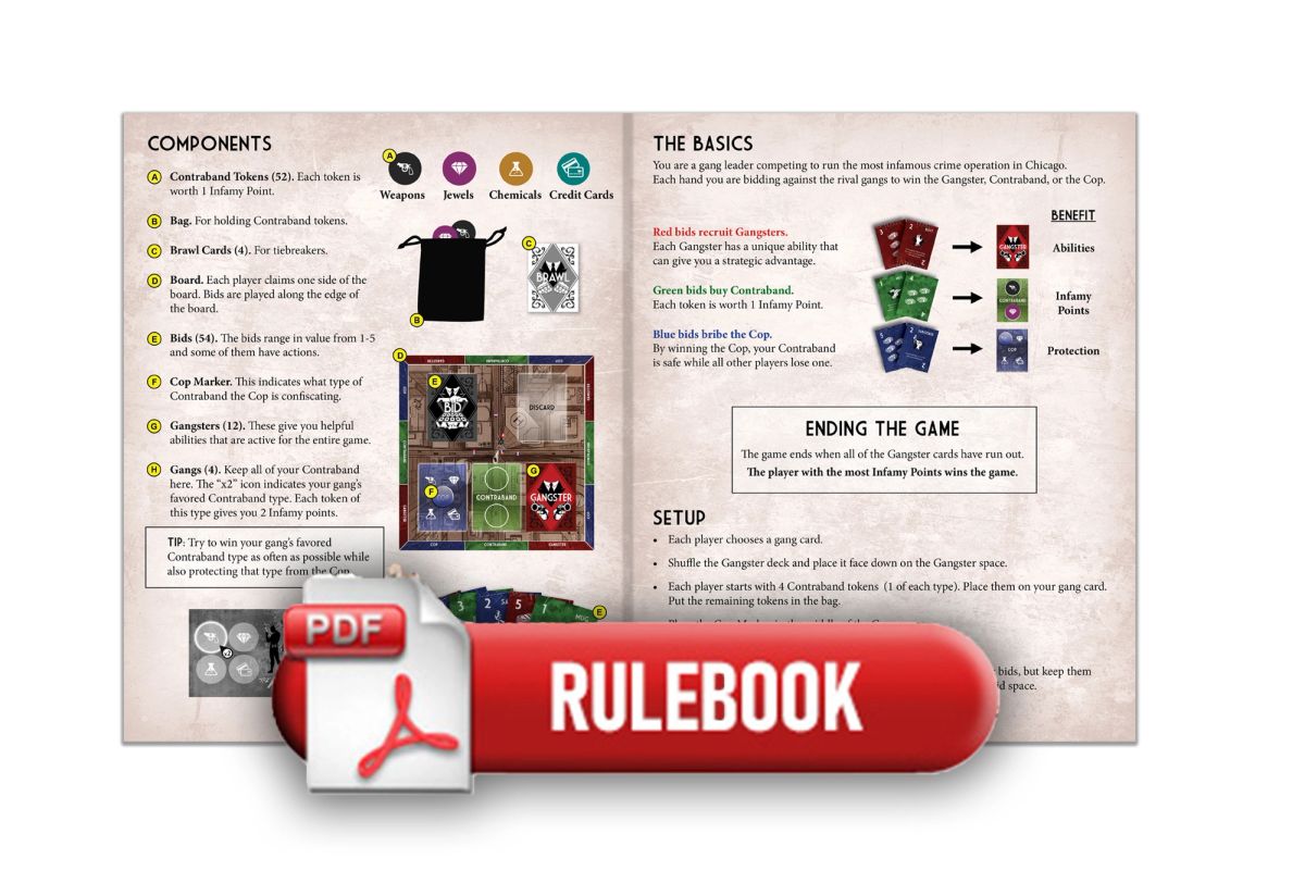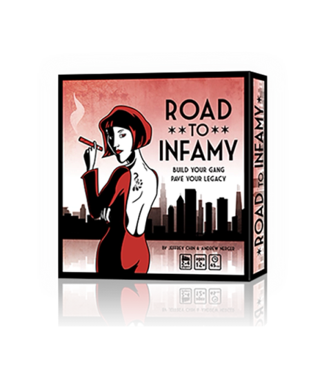 Road To Infamy is a crime-themed board game for 2-4 players. You are a wealthy gang leader competing to run the most infamous crime operation in Chicago. You will place bids on the black market to recruit gangsters with unique abilities, buy contraband to become more infamous, and bribe the cop to protect your goods and sabotage your rivals.