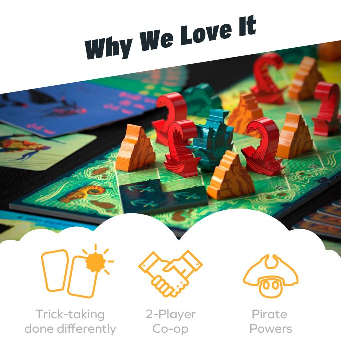 Sail is a logic-driven deduction game. But, your plans get a wrench thrown in because of the lack of communication! As you play, you’ll become better at understanding the way your partner wants to play. Passing cards, winning tricks in certain ways… try and read their mind to defeat the kraken!