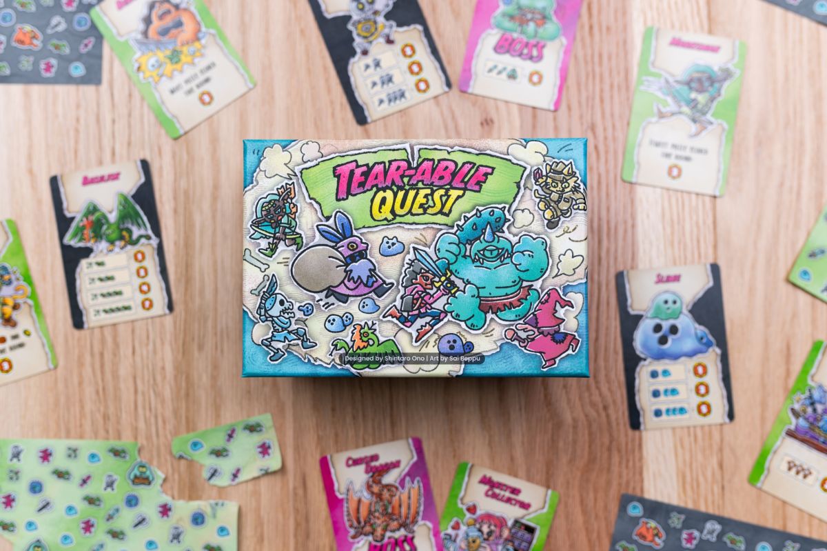 Start a 2-minute timer and start questing! To complete a quest, tear off the exact icons shown on the card (and no extras). Make sure that the icons are fully showing on your torn-off pieces—partials don’t count! You can tear off multiple instances of the active quest to score even more.