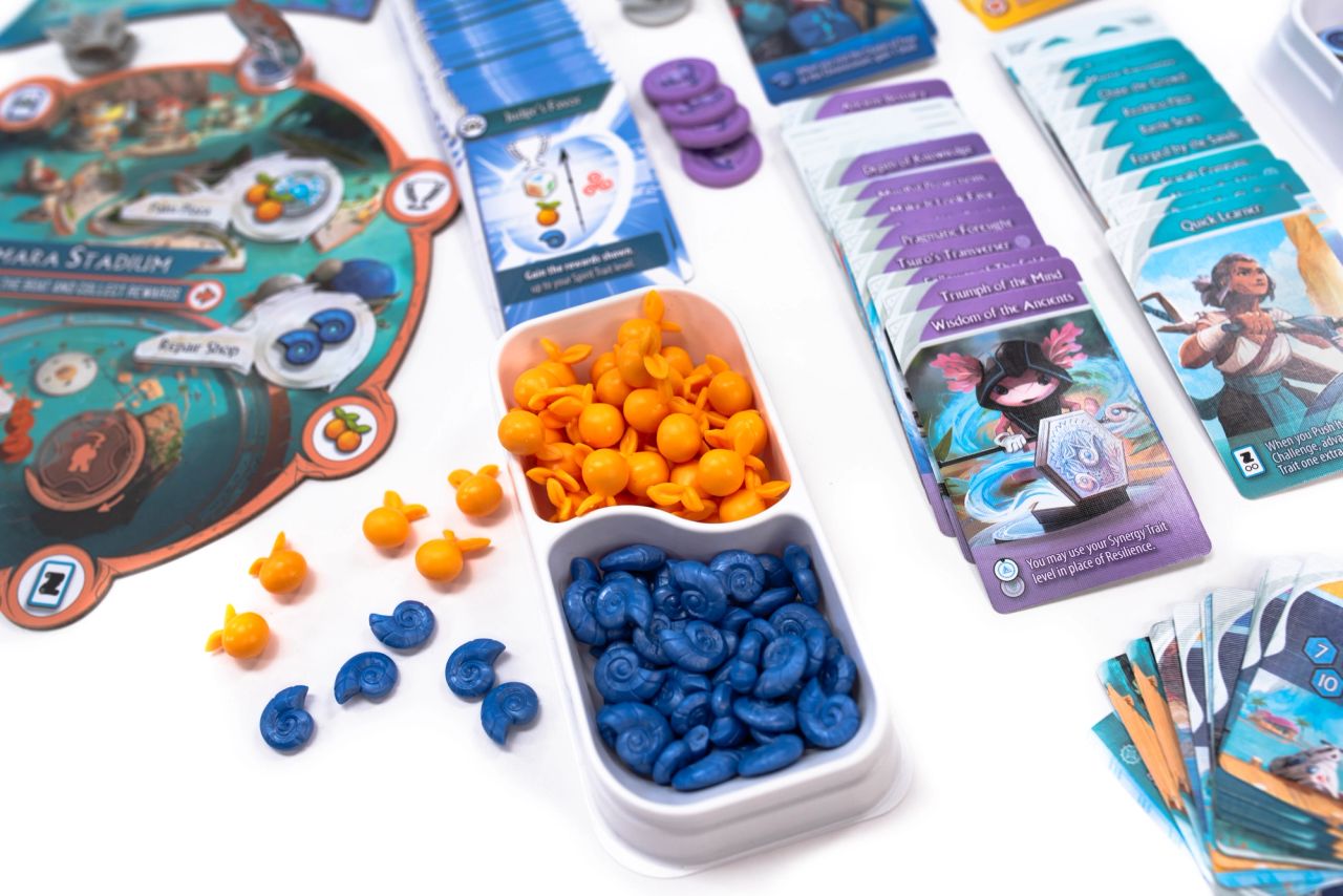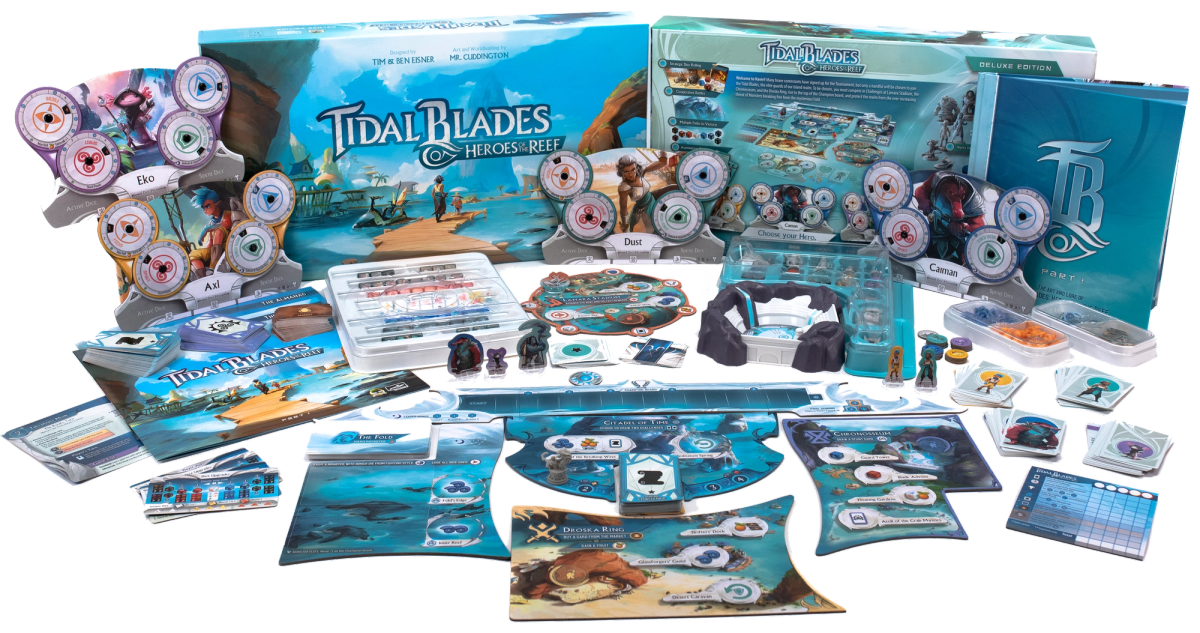 In Tidal Blades: Heroes of the Reef, each player takes the role of a young hero competing to be named a Tidal Blade. By gathering the needed resources, signing up to compete in Challenges, and timing your arrival at different islands you can make the most of your Hero’s turns and rise in the ranks of the contestants.