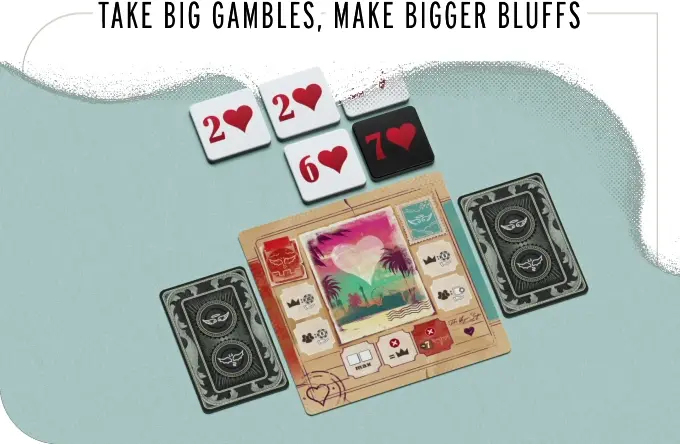 Vegas Strip has that classic bluffing feeling from games like Skull, Cockroach Poker, and BS. The whole table watches as you make your turn – there’s no hiding when it comes to keeping a straight face. Better keep your cool!